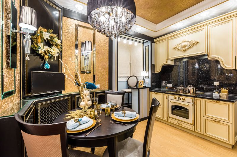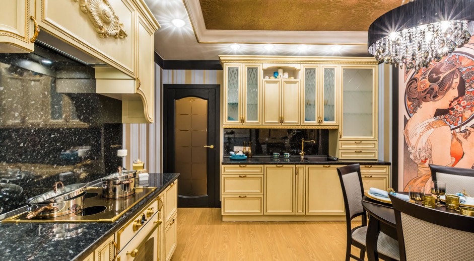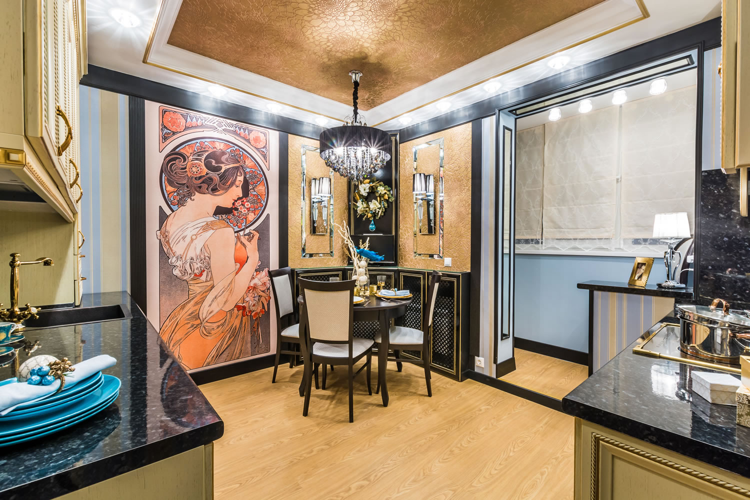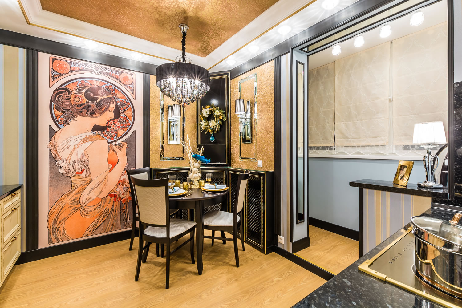 Сама же кухня переполнена различными деталями, дополняющими друг друга, подчеркивающими особый лоск и одновременно легкость интерьерного решения в стиле ар-деко. Особенности оформления кухонной комнатки:
