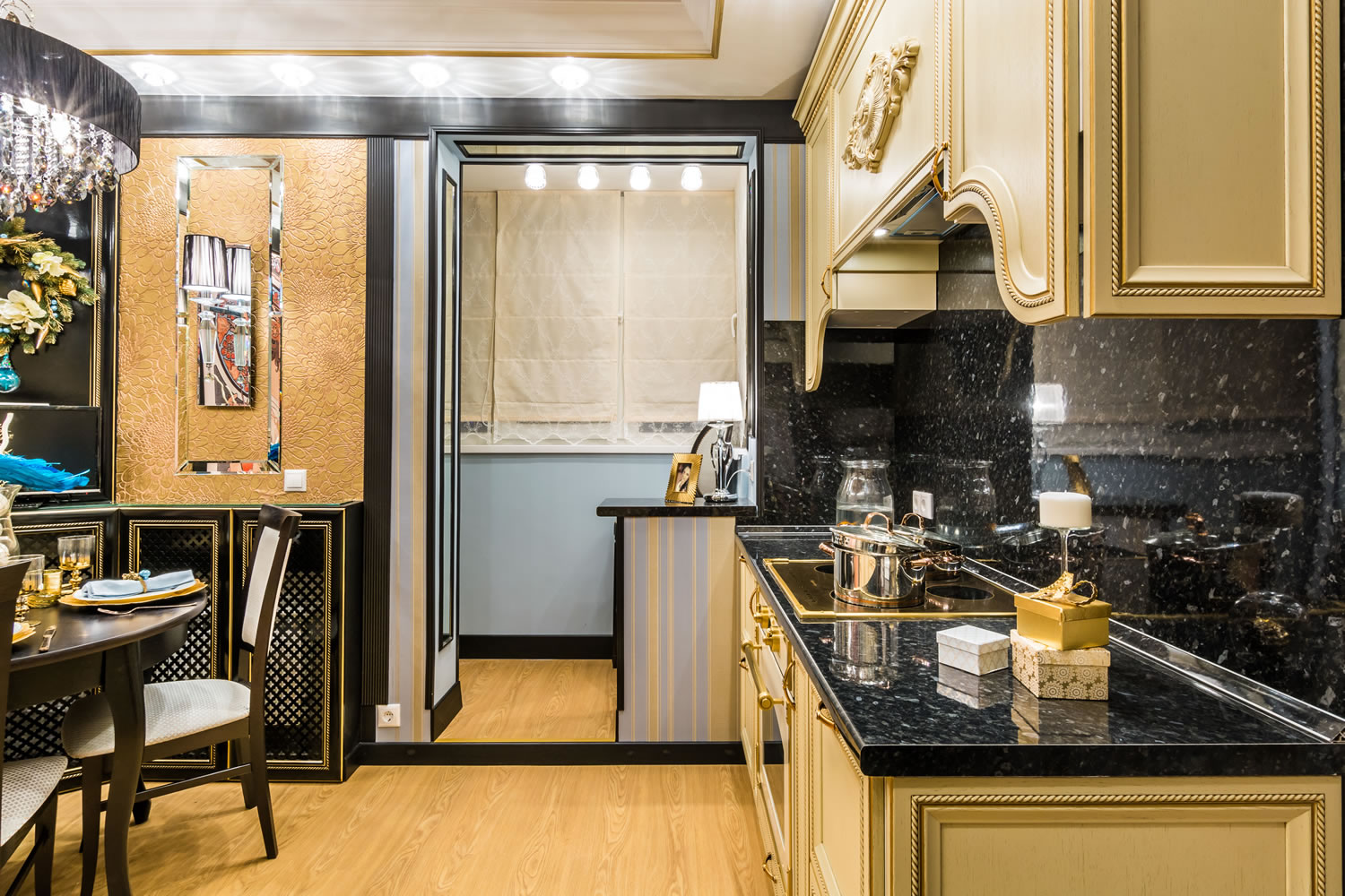 Уникальный проект «Золотые грезы ар-деко» – это идеальное соотношение роскоши, элегантности, функциональности, шика. Мебель и декоративные элементы кухни выполнены в цвете благородного золота, которое гармонично сочетается с оливковыми, голубыми, черными и коричневыми тонами. Изначально, миниатюрная кухонька расширена благодаря утепленному балкону, именно это место стало зоной отдыха, выполненной в кардинально иных тонах, чем весь интерьер комнаты. Небольшое уютное кресло, красивый комод и настольная лампа, отлично располагают к душевной беседе или отдыху.