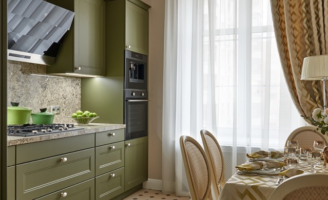 Маленькая кухонька, при помощи разных окон и правильного расположения мебели, превратилась в отдельную рабочую и кухонную зону. С одной стороны, современный пластиковый стеклопакет, пропускающий максимальное количества света в дом, в другой – уютная мини-комнатка с деревянным окном, столом, небольшим угловым диванчиком и стульями. К прочим достоинствам интерьера «Оливковой кухни» можно отнести:
