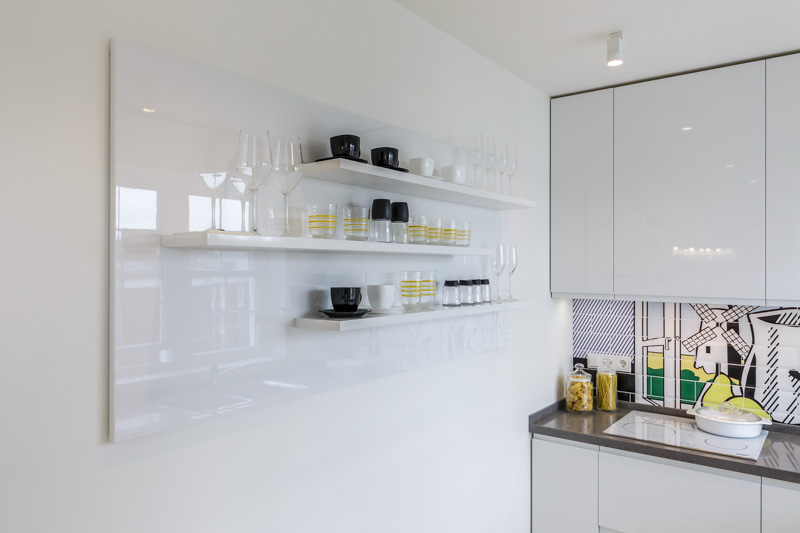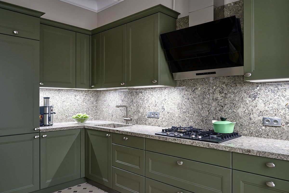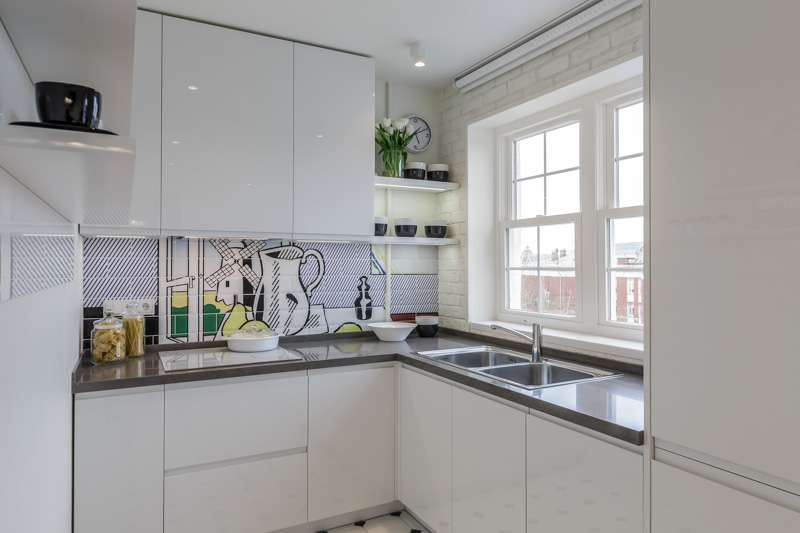 · Яркие акценты в виде кафельного панно у рабочей зоны, красочной картины-натюрморта и прочих аксессуаров.