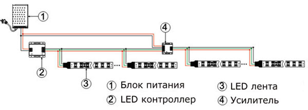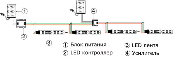 Усилитель RGB-сигнала используется в тех случаях, когда к RGB-контроллеру необходимо подключить нагрузку, большую, чем позволяет данный контроллер. Ниже приведены схемы подключения RGB-усилителя взависимости от количества блоков питания (1 или 2).