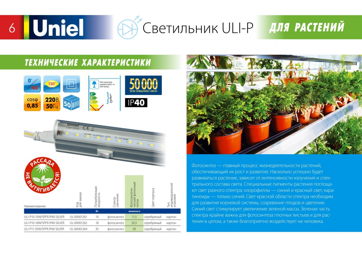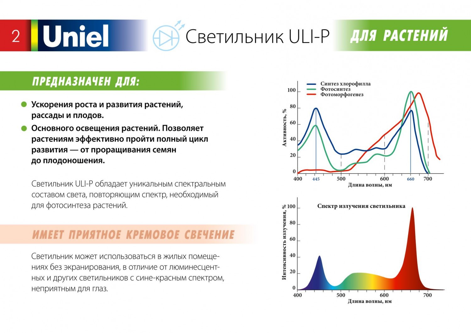 Светильник ULI-P обладает уникальным спектральным составом света, повторяющим спектр, необходимый для фотосинтеза растений. Светильник может использоваться в жилых помещениях без экранирования, в отличие от люминесцентных и других светильников с сине-красным спектром, неприятным для глаз.