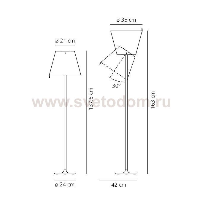 Напольный светильник. Возможные варианты рассеивателя : бежевый, серый металлик. Возможные цвета арматуры : матовый бронзовыйи матовый аллюминий. Абажур с боковой прорезью, что позволяет фиксировать абажур в трех разных позициях. Артикул торшера с основанием бронзового цвета : 0123020A |