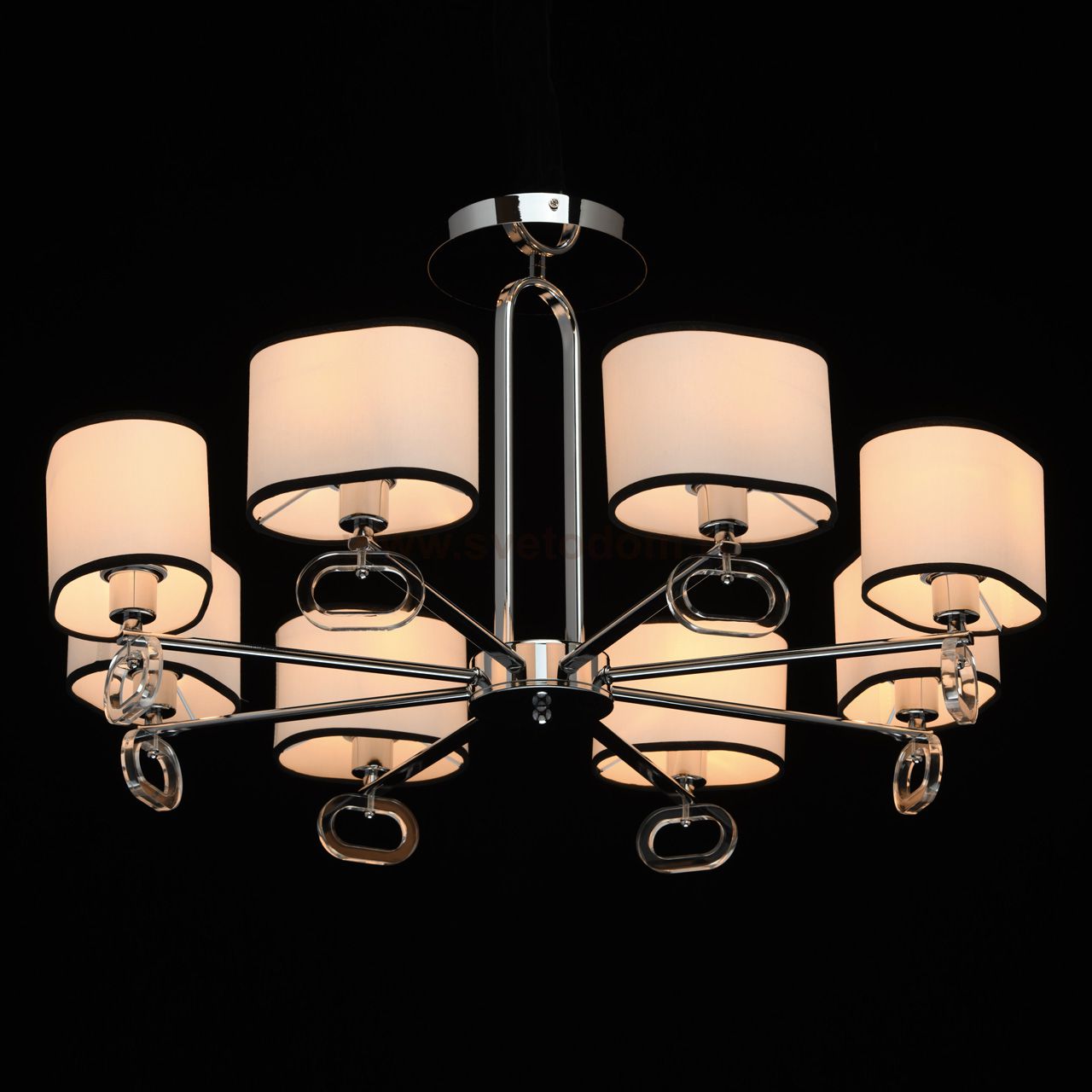 Основание изготовлено из металла и гальванизировано в цвет хрома. Абажуры: текстиль белого цвета с термостойким акрилом внутри. Тесьма черного цвета по канту.Декоративные элементы из прозрачного акрила. Комментарий