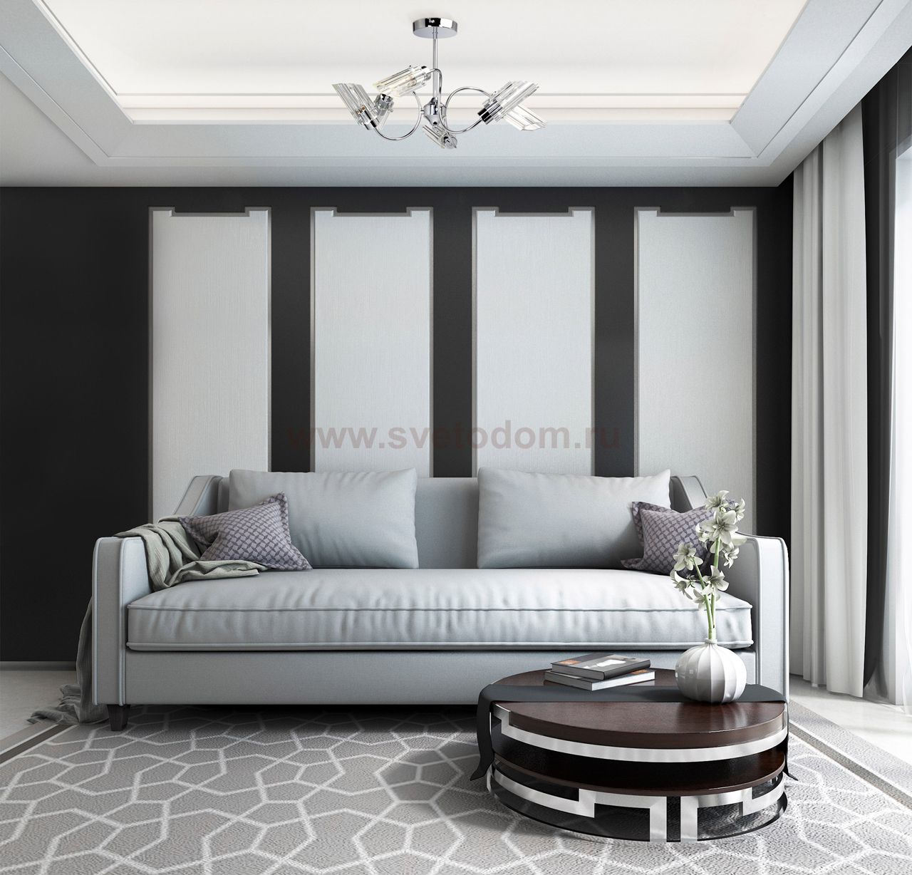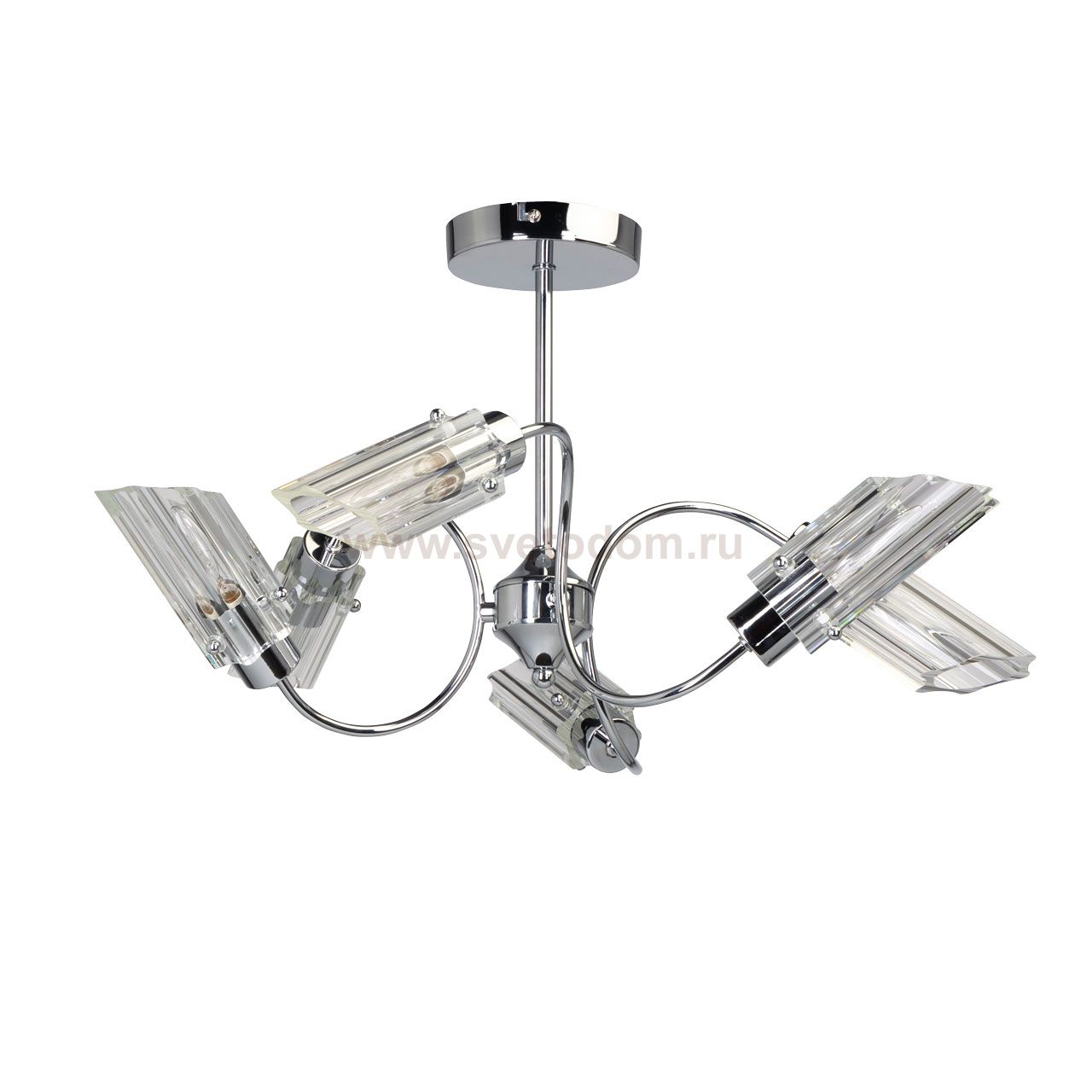 Металлическое основание потолочной люстры гальванизировано в цвет хрома. Люстра декорирована прозрачными фактурными стеклянными плафонами вытянутой формы. Комментарий