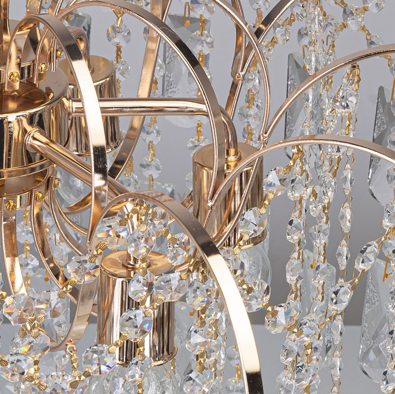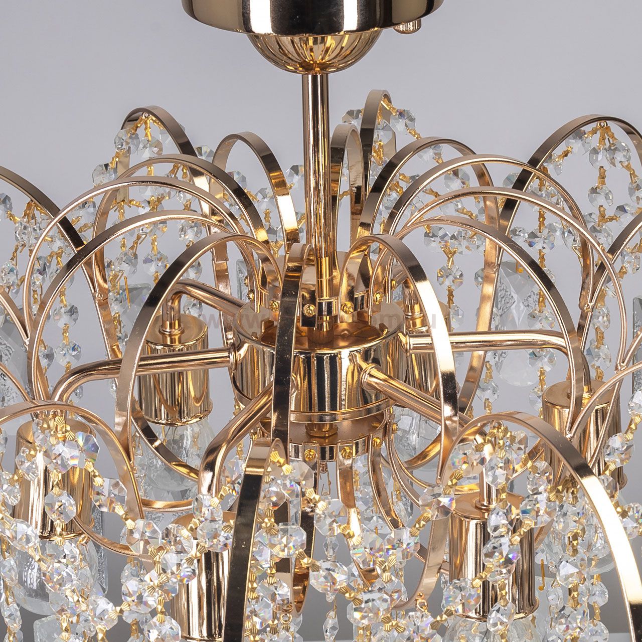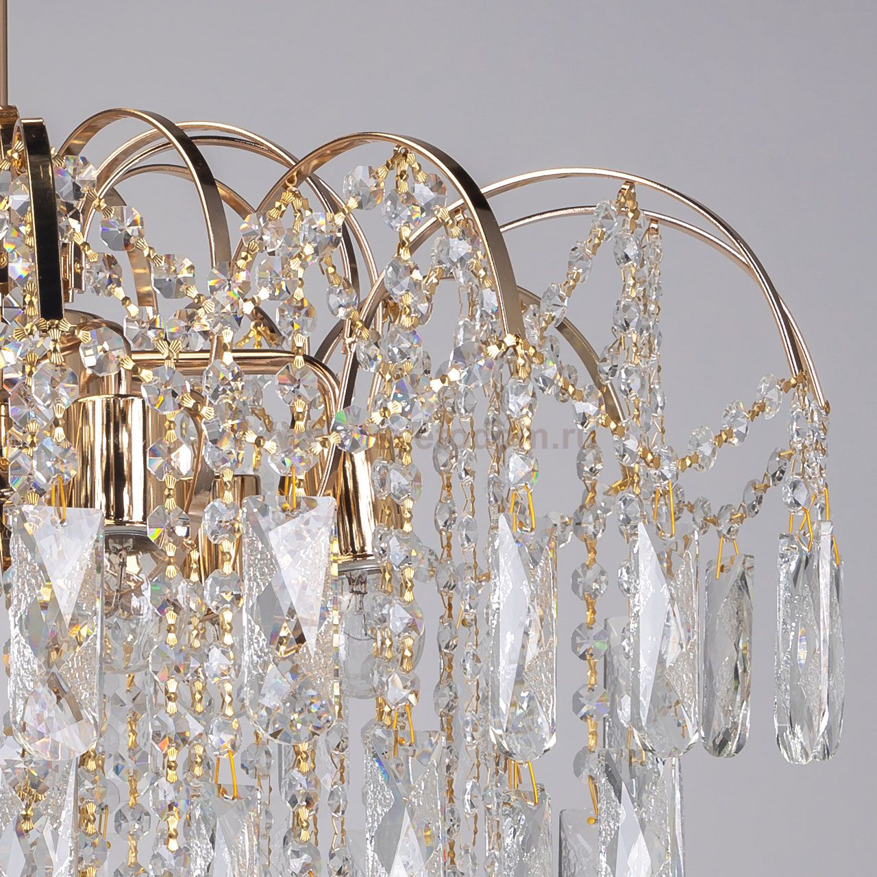 Металлическое основание светильника гальванизировано в цвет золота. Подвесная люстра декорирована прозрачным хрусталем. Комментарий