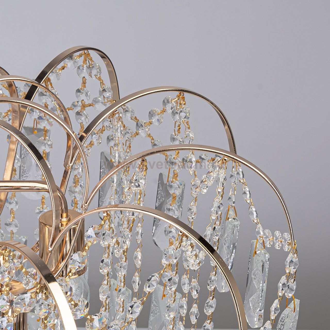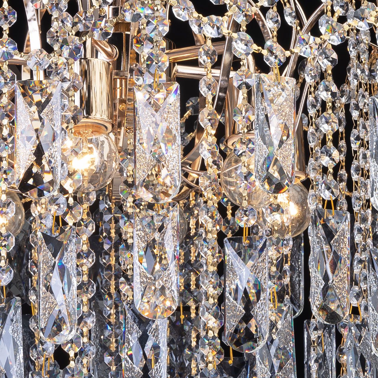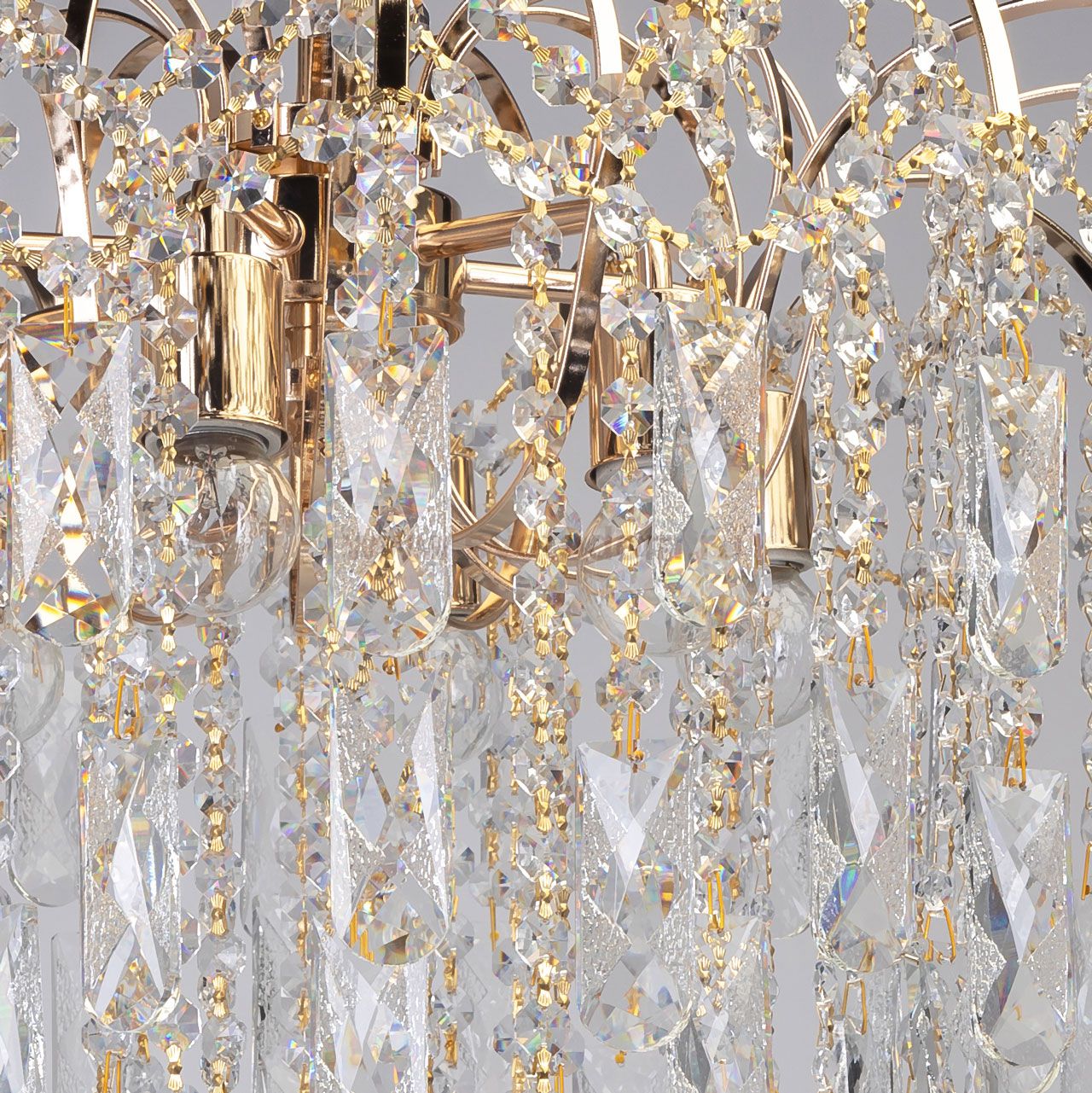 Металлическое основание светильника гальванизировано в цвет золота. Подвесная люстра декорирована прозрачным хрусталем. Комментарий