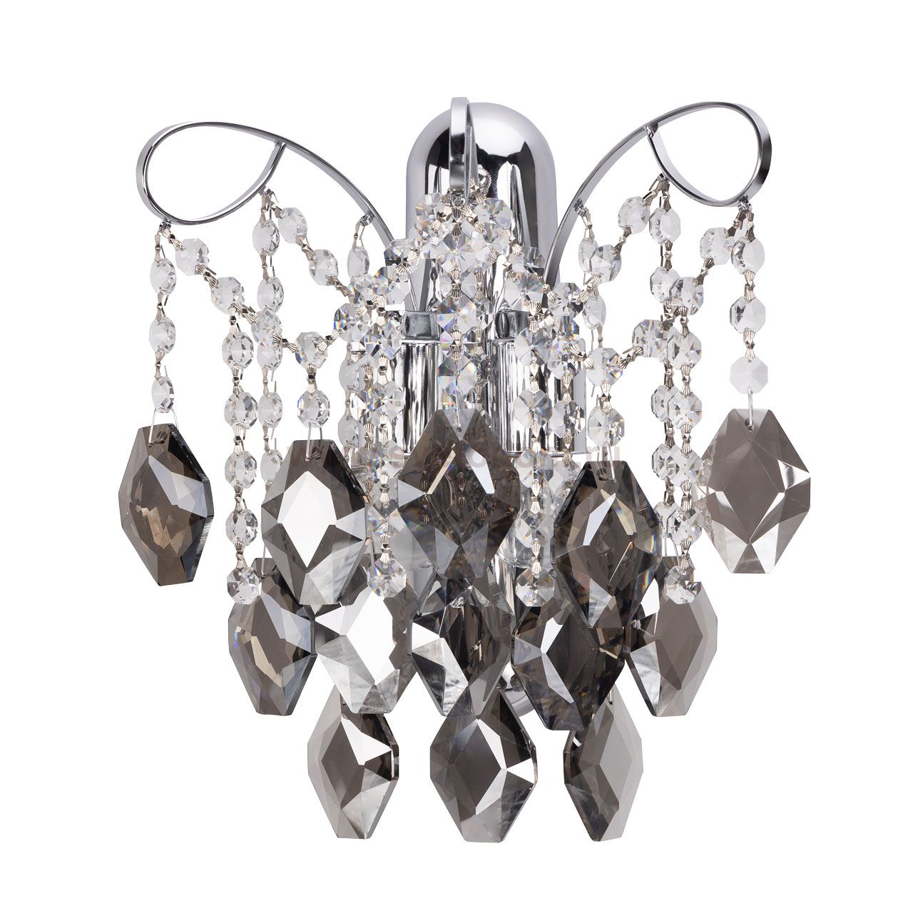 Металлическое основание гальванизировано в цвет хрома. Вертикальное настенное бра декорировано хрусталем формы ромбов, гальванизированным в дымчатый цвет и прозрачным хрусталем в форме октагонов. Комментарий