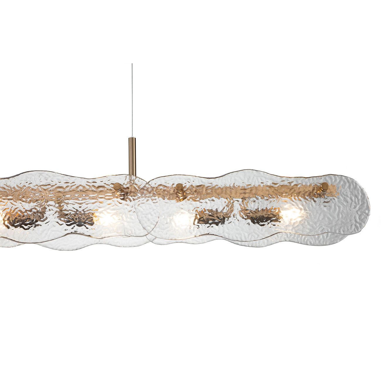 Элегантность очаровательна. Она всегда обращает на себя внимание восторженных взглядов. Главный секрет элегантности заключается в том, что в ее образе простота виртуозно сочетается с изящностью. В серии светильников Eleganza утонченные и текстурные стеклянные пластины сочетаются с простым металлом латунного цвета, придавая вашему дизайну элегантные ноты. Размер 1200*130*155/1155 Мощность E14 60Wх6 Цвет ЛАТУНЬ/ПРОЗРАЧНЫЙ С ЭФФЕКТОМ ВОЛНЫ Материал МЕТАЛЛ/СТЕКЛО