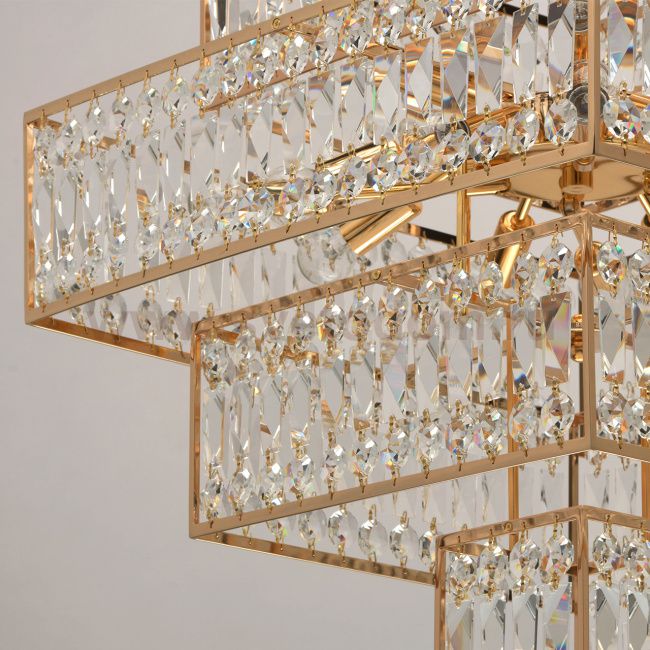 Модерновая люстра сочетает в себе элементы классической роскоши и современного гламура. Основание выполнено из металла драгоценного золотого оттенка. Его геометричная форма выглядит оригинально и необычно, а богатый декор из прозрачного хрусталя различных форм огранки создает многогранную игру света и подчеркивает торжественную красоту светильника.