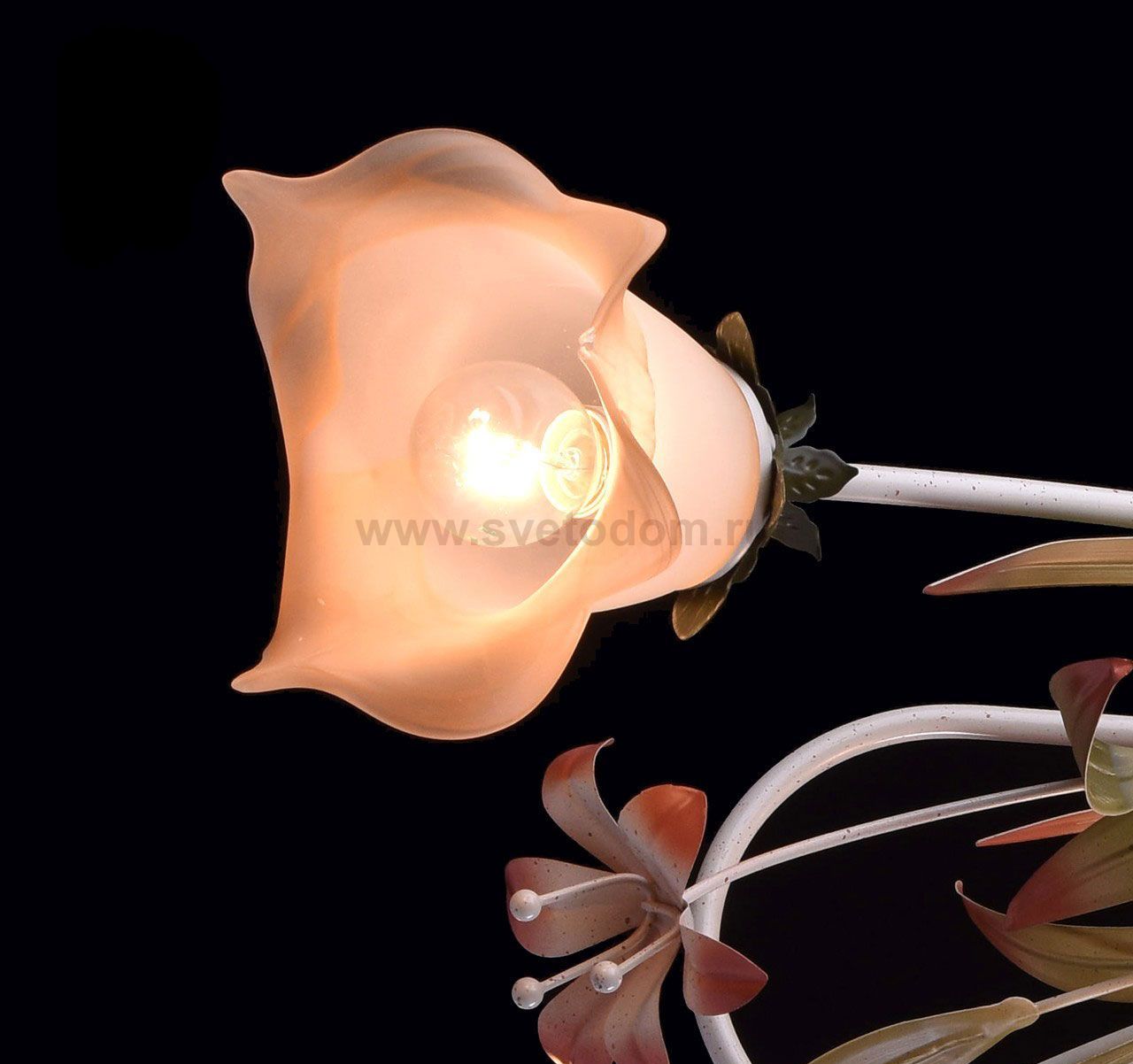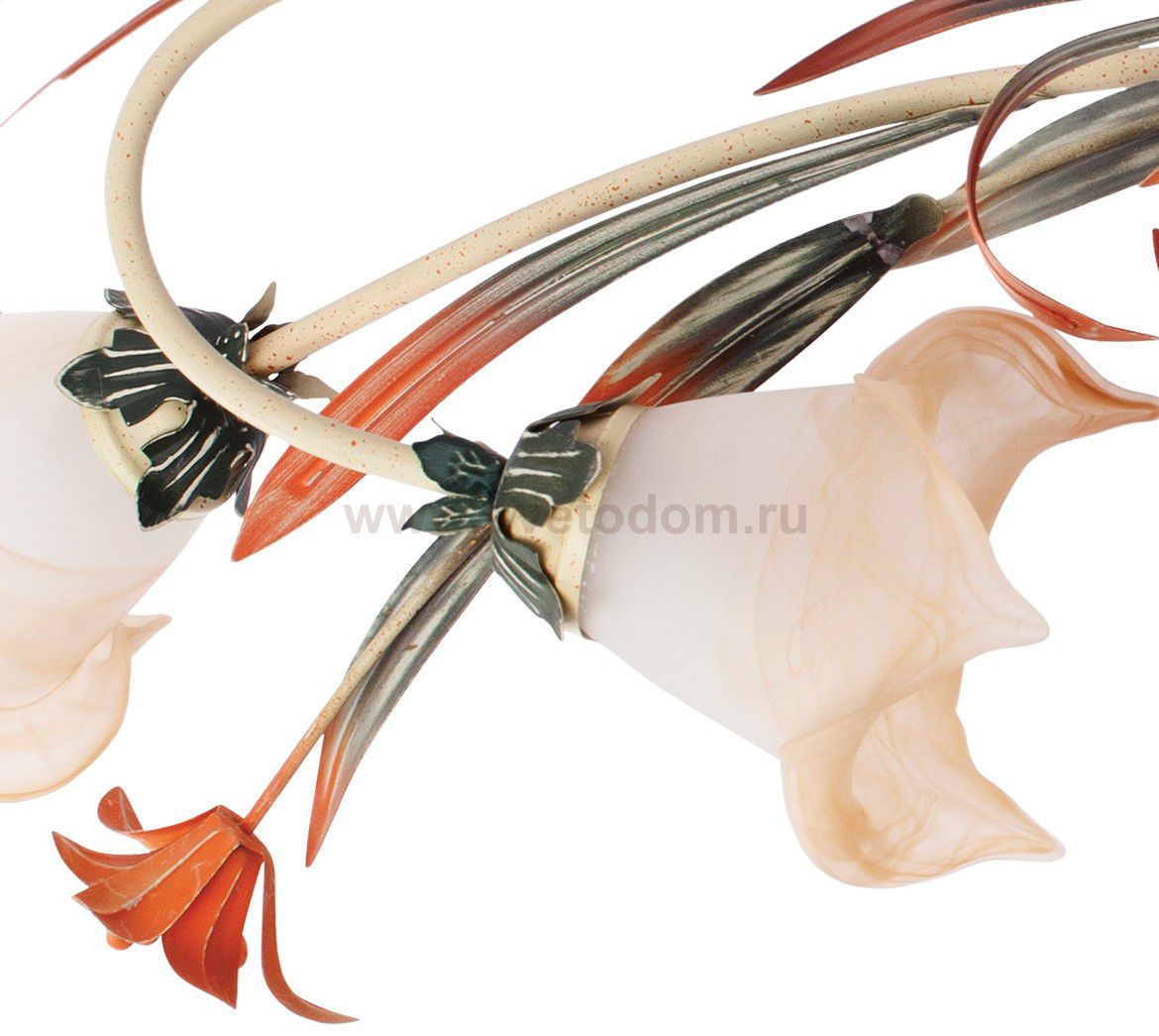 Дизайн свеильника в популярном флористическом стиле. Высокие параметры освещенности. Теплая цветовая гамма светильника позволяет создать уютную атмосферу. Потолочная люстра - идеальный вариант для стандартных потолков. Технология производства