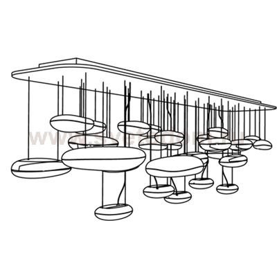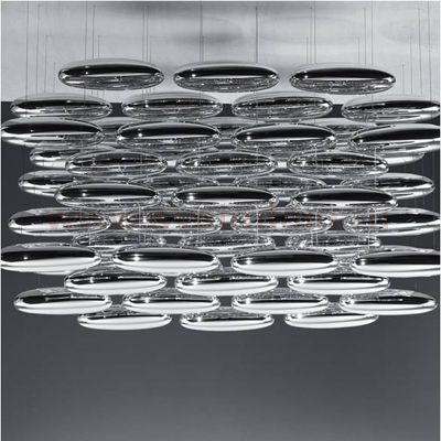 Подвесной светильник, алюминиевая арматура, рассеиватели - поированный хром. Лампы включены в комплект. Возможен специальный светильник по Вашему эскизу со множеством источников, а также , подсветки прожекторами встроенными в стены и инаправленными на рассеиватели без источников освещения.Внимание!Возможен вариант со светодиодными источниками, артикул 1367010A.