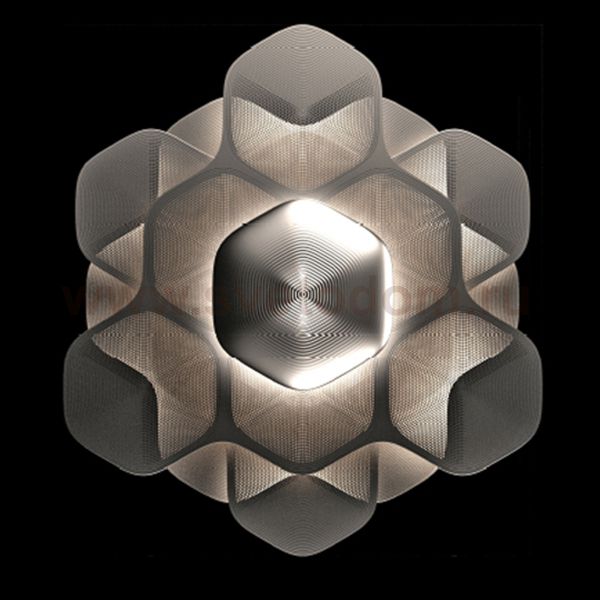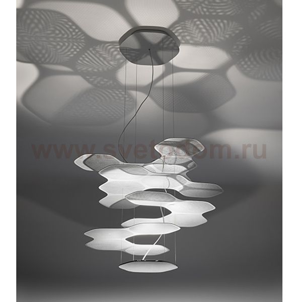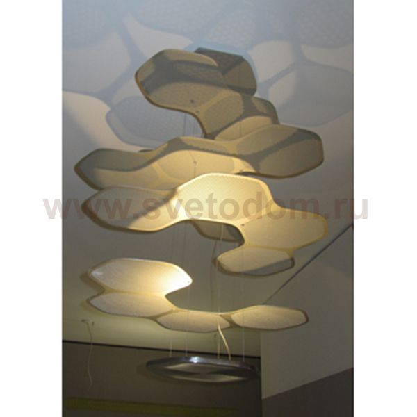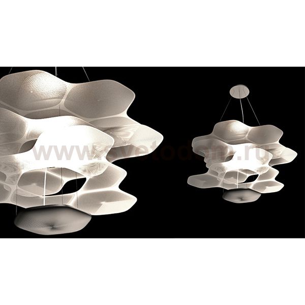 Подвесной модульный светильник Space Cloud, в переводе облачный космос, выполнен из легкого алюминия серого цвета с перфорацией, использует не прямой, а отраженный свет, так как светодиодный источник света светильника направлен вверх. Идея этой модели родилась у дизайнера Ross Lovegrove после просмотра фотографий, сделанных из космоса, когда виден свет, отраженный от Земли. Модули светильника располагаются на разной высоте от источника света, их можно соединить как вертикально, так и горизонтально. При включенном светильнике на потолке появляется удивительная игра света и тени. Данная модель прекрасно подойдет для оформления и освещения гостиной, спальни, а также отеля, ресторана.