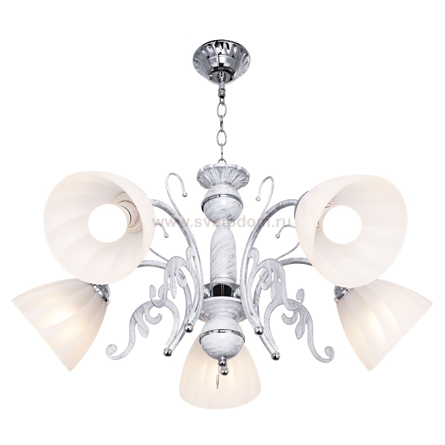 Люстра классическая 2031H/5WT+SV WT от бренда ЭкономСвет. Каркас выполнен из материала металл; цвета: серебро и белый. Плафоны (светорассеиватели) выполнены из материала стекло, цвет белый. Цоколь E27 рассчитан на лампы максимальной мощности до 40 Вт, а максимальная площадь освещения составит до 11 м?.