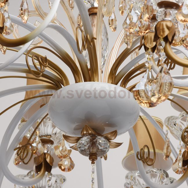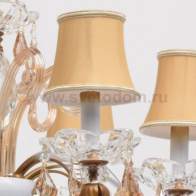 Металлическое основание белого и золотого цветов, декоративные элементы из выдувного стекла, хрусталь прозрачный и цвета топаза, атласные абажуры. Материал плафона