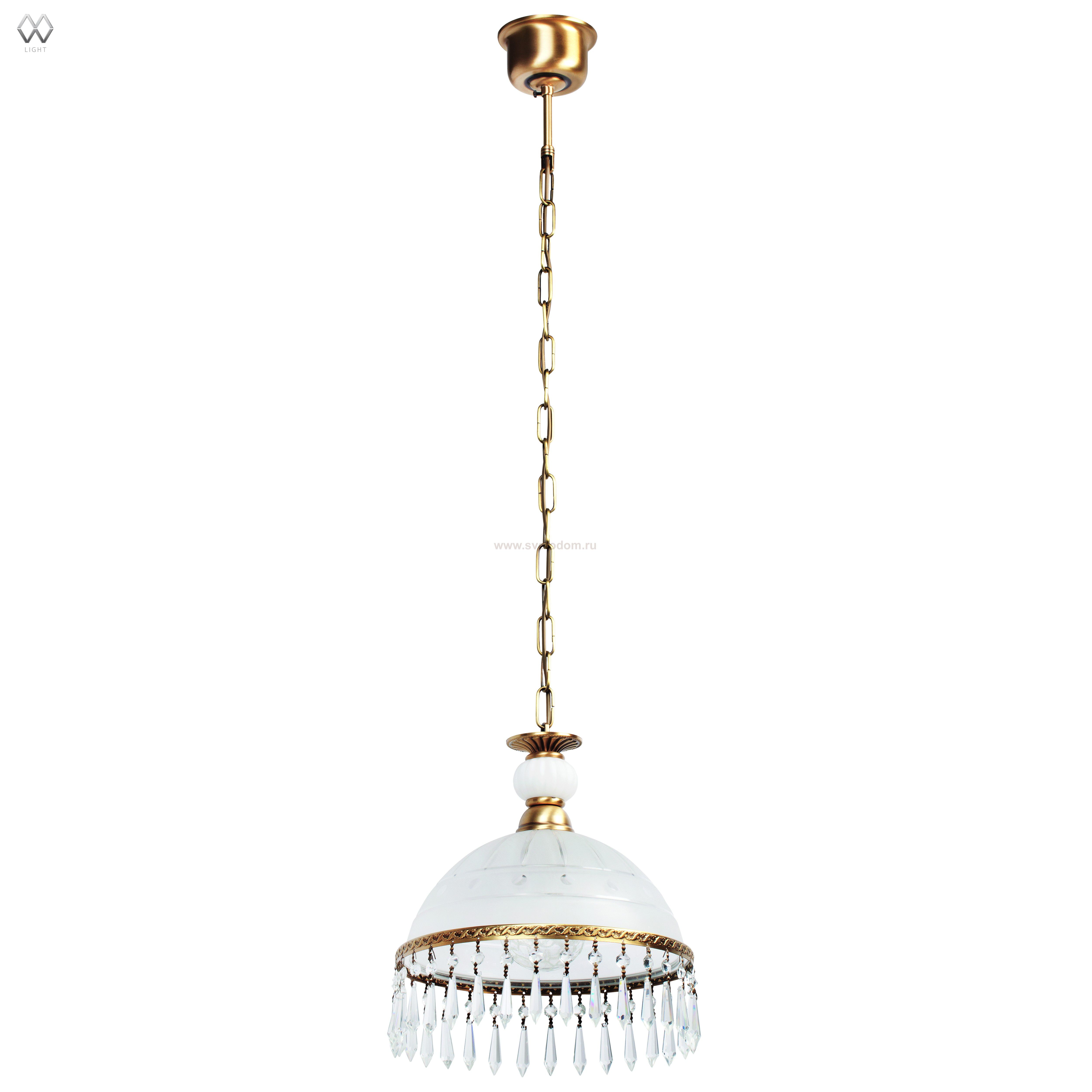 Основание из латуни, стеклянный плафон с резным узором, декоративные подвески из хрусталя. Материал плафона