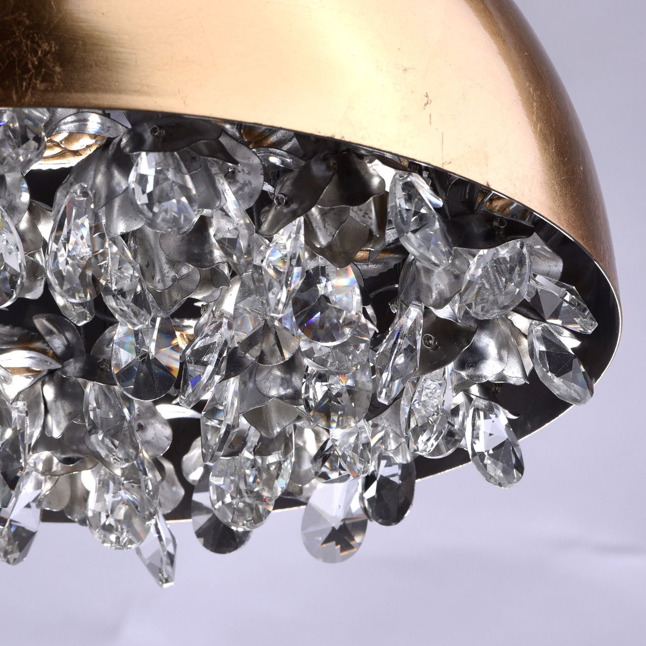 Корпус светильника выполнен из металлического сплава и обработан по технологии поталь. Технология нанесения потали идентична технологии работы с сусальным золотом и с сусальным серебром. Корпус светильника покрыт золотой поталью. Изнутри, светильник декорирован подвесками из высококачественного хрусталя и цветами, выполненными из сплава металла и покрытыми серебряной поталью. Комментарий