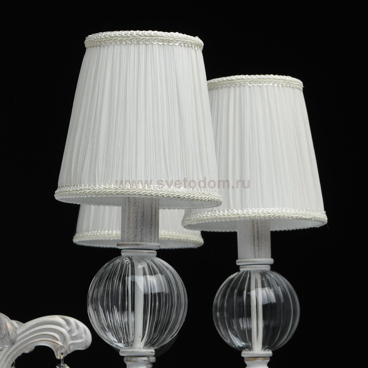 Основание светильника выполнено из комбинации сплавов металлов и обработано по технологии хай-лайт, основной слой белого цвета, декоративный слой цвета золота. Рожки, верхняя и нижняя часть корпуса выполнены из сплава алюминия по технологии художественного литья. Декоративная розетка выполнена из металла по технологии прессования. Абажуры из двойного текстиля белого цвета с добавлением тонкой нити люрекса золотого цвета. Кант в верхней и нижней части абажура. Светильник декорирован выдувным стеклом и прозрачным хрусталем формы октагон. Комментарий