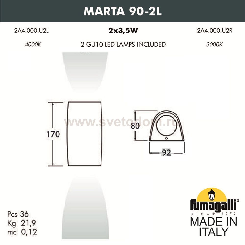 Касаемо артикула 2A4.000.000.AXU2L важно знать - Фасадные светильники FUMAGALLI серии MARTA, модель MARTA 90-2L - изготовлена в Италии. Светильник применяется для акцентной, архитектурной, декоративной и фасадной подсветки коттеджей, загородных домов, дачных домов, кафе, ресторанов, других зданий и сооружений. Может использоваться на только снаружи, но и внутри зданий как настенные дизайнерские светильники. Крепится на стену, имеет два источника света направленных вверх и вниз. Корпус изготовлен из современного вандалостойкого, негорючего полимера RESIN. Прочного, антивандального, окрашенного в массе, не ржавеющего и не выгорающего на солнце. Фасадный светильник MARTA имеет двойную электроизоляцию. Все светильники пыле-влаго защищены по стандарту IP55. Диапазон рабочих температур от -60 до +90С.