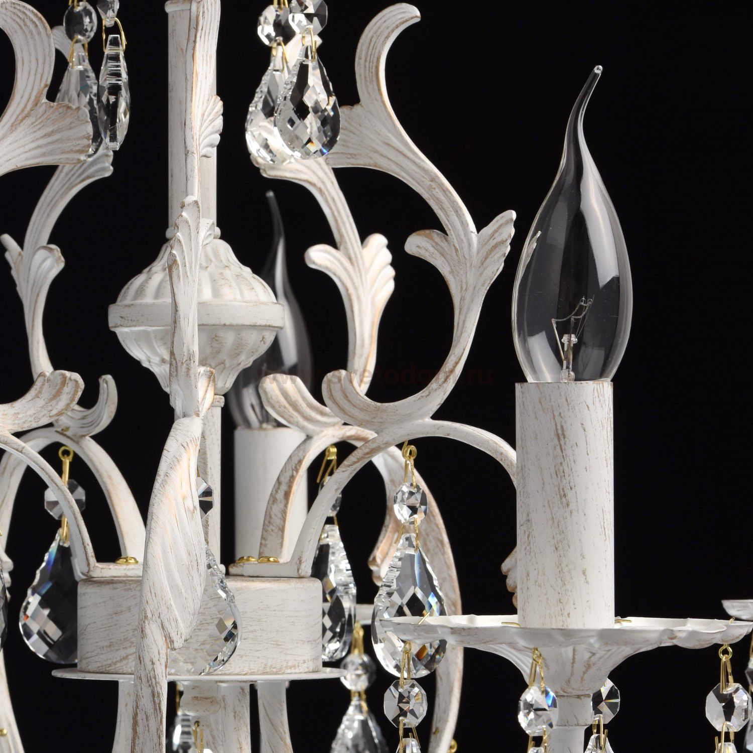 301019805 - это Изящная и грациозная люстра из коллекции «Свеча» станет роскошным украшением интерьера. Металлическое основание матового белого цвета дополнено эффектом патины в цвет золота. Под стать ему царственно изогнутые рожки, каждый из которых завершают свечи – источники света. Люстра выглядит особенно празднично и богато благодаря декору в виде плавных завитков в растительной стилистике и крупных переливающихся подвесов из прозрачного хрусталя.
