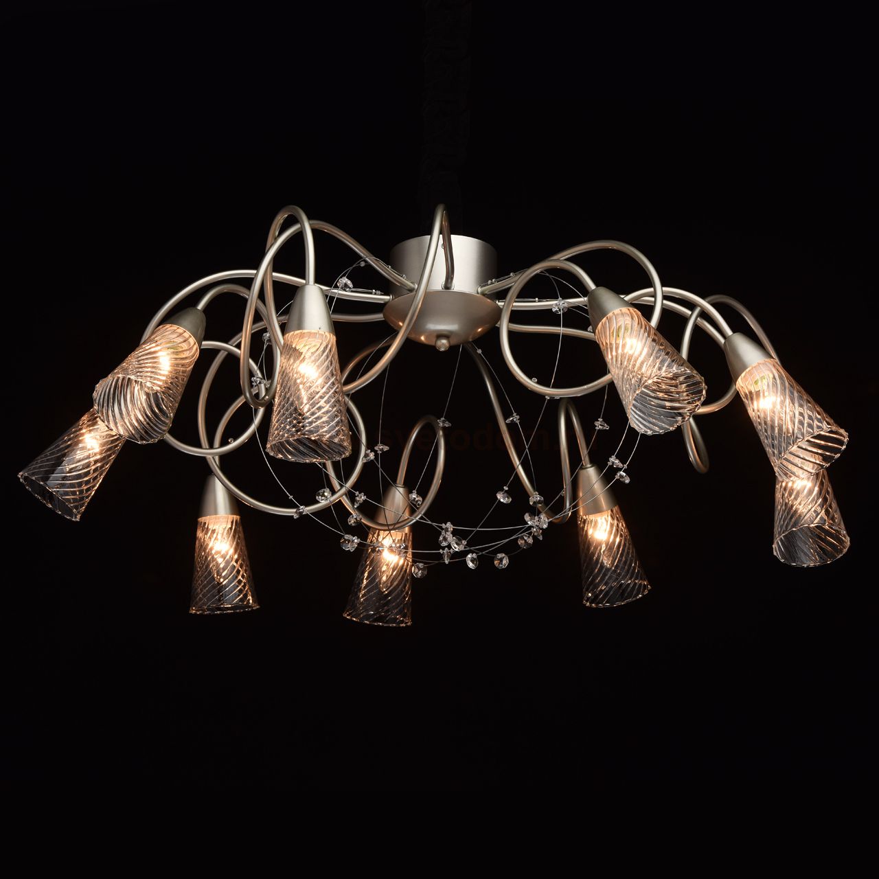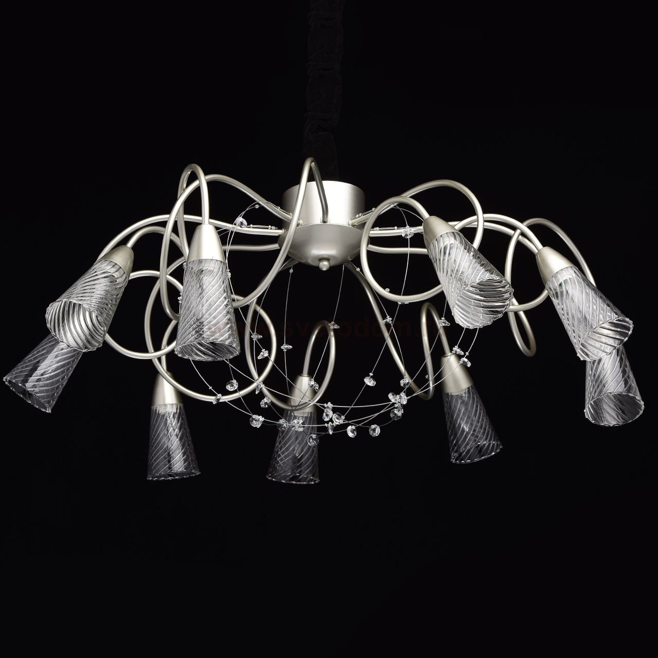 Арматура выполнена из сплава металла с последующим окрашиванием в цвет серебра. Плафоны из высококачественного прозрачного стекла отлиты в сложную форму. Кромка плафонов гладкая, обработана по технологии фацетирования. Светильник декорирован металлическими нитями, также окрашенными в цвет серебра, с украшениями хрусталем восьмигранной формы. Комментарий