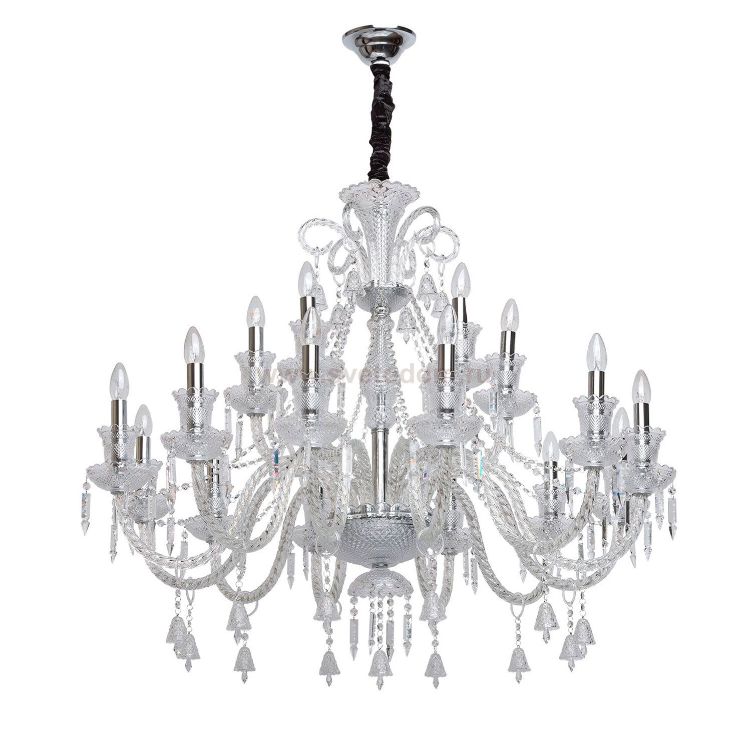 Арматура светильника из сплава металла, гальванизирована в цвет хрома, декорирована прозрачным хрустальным стеклом грановитой огранки. Розетки и декор центральной оси выполнены в одном стиле. Витые рожки произведены гутным способом. Светильник декорирован подвесками из хрусталя F&D 3-х видов оригинальной огранки и оригинальными декоративными элементами. Комментарий