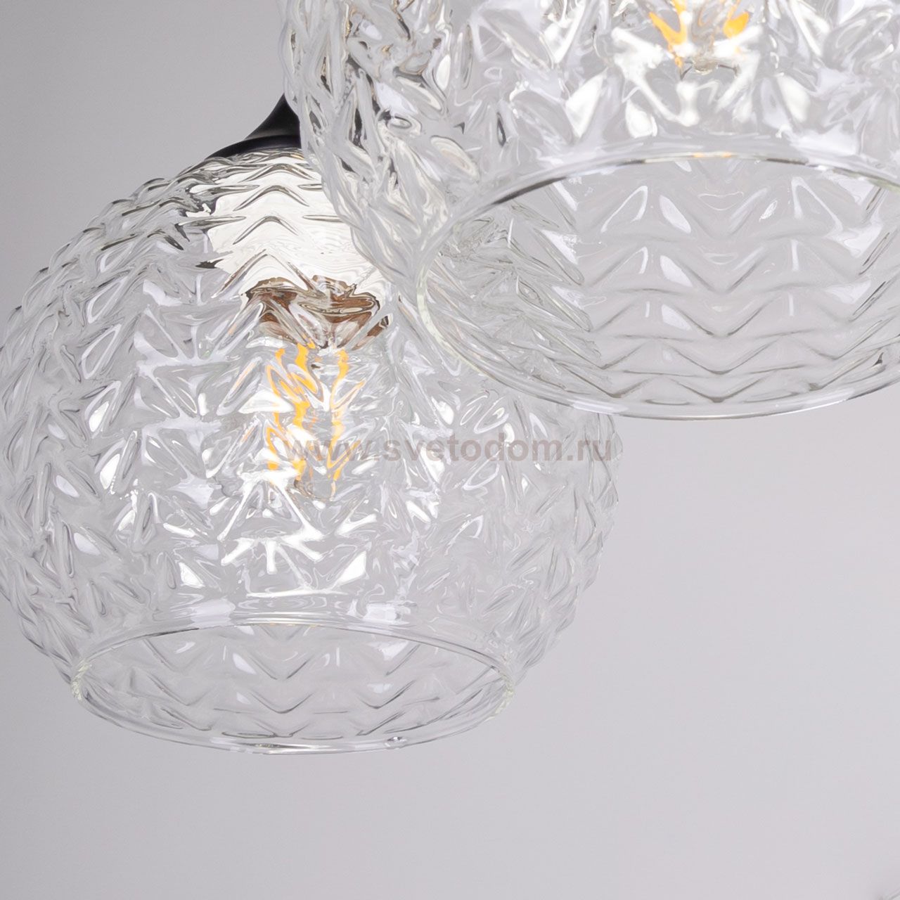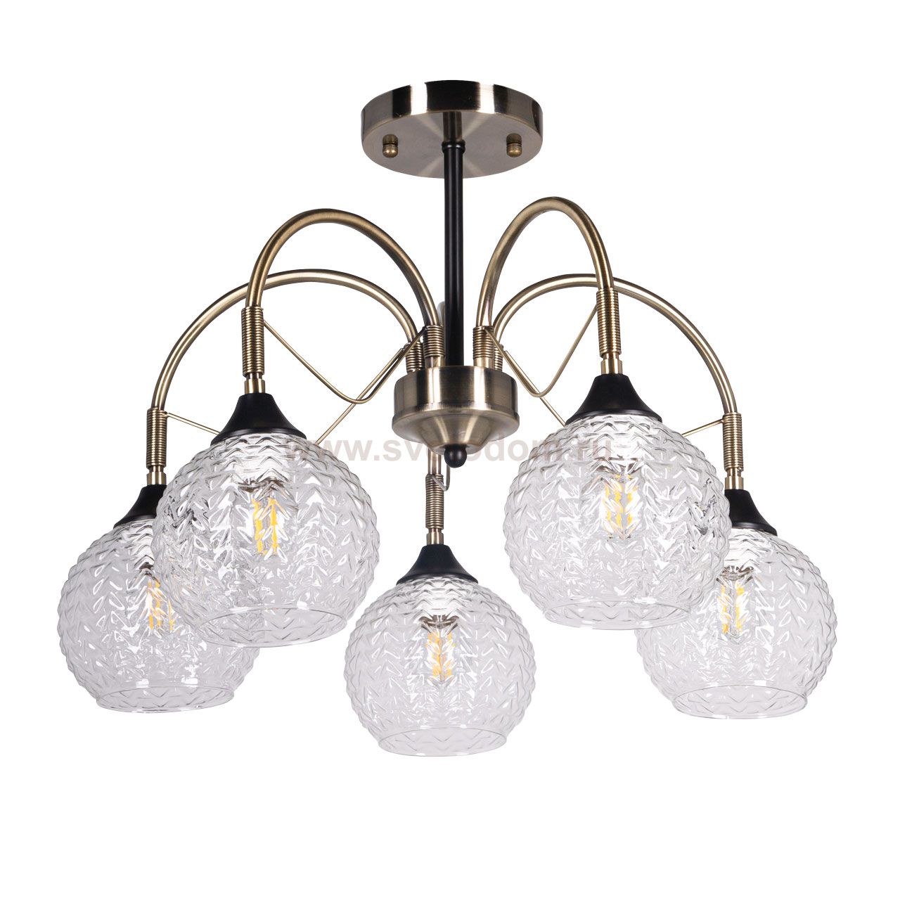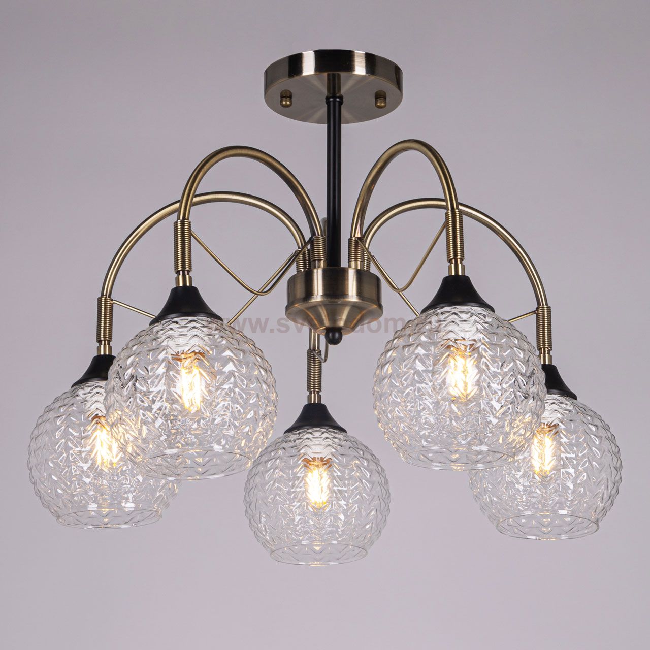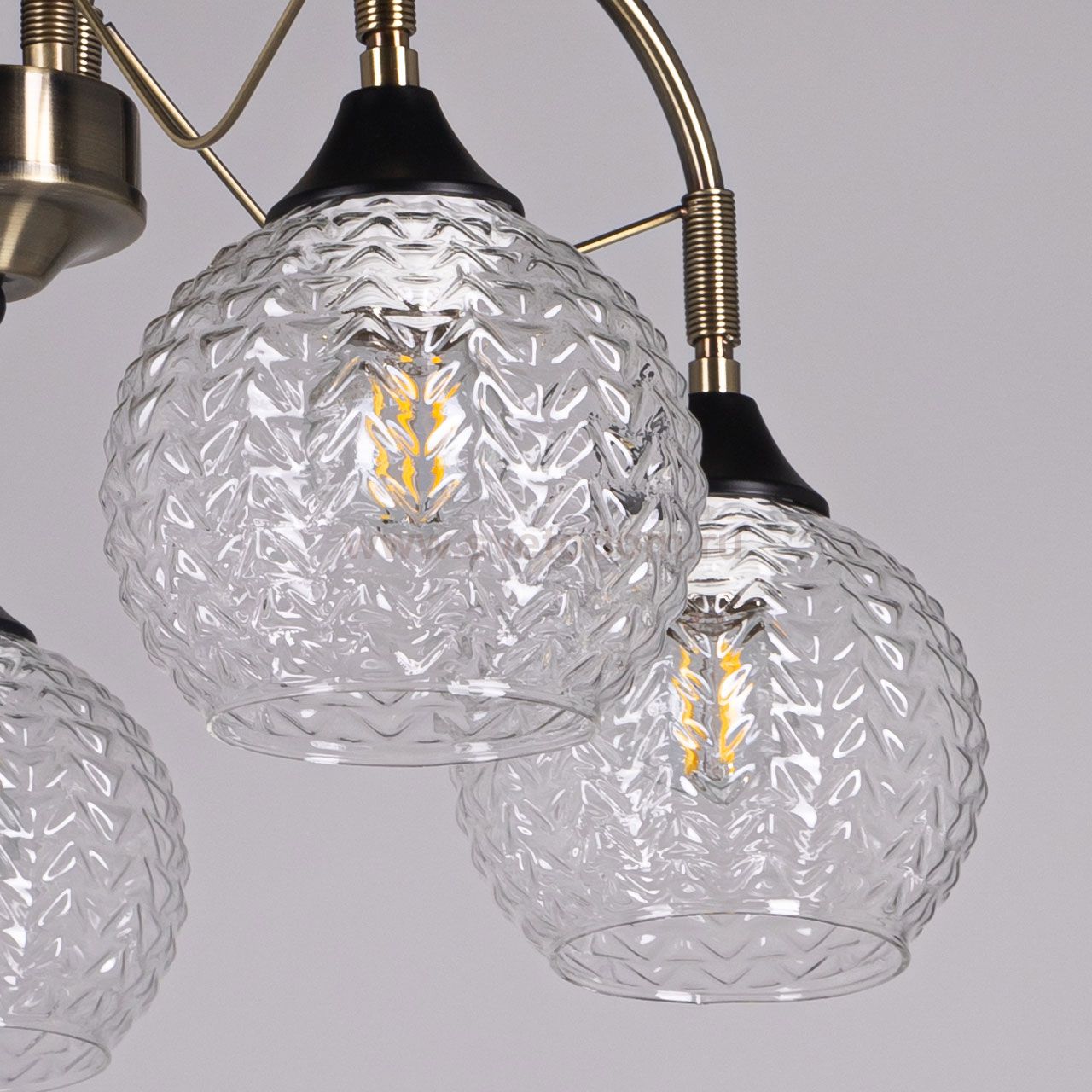 Металлическое основание потолочной люстры гальванизировано в цвет античной бронзы. Отдельные элементы основания окрашены в черный цвет. Потолочная люстра декорирована плафонами из фактурного стекла, отлитого в сложную форму. Комментарий