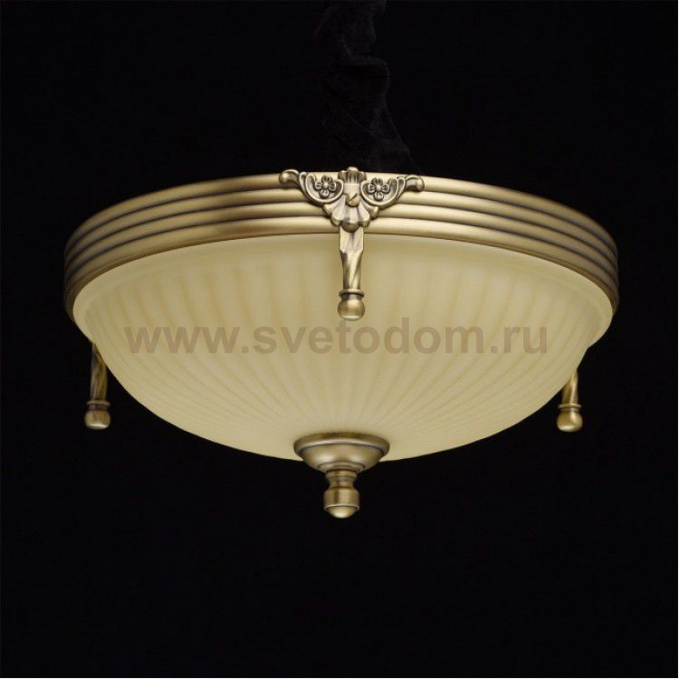 Корпус светильника выполнен из сплава железа и гальванизирован в цвет античной бронзы с эффектом патинирования. Плафон из стекла, окрашенного в массе в цвет ванили, отлит по сложной форме и матирован. Центральный плафон декорирован художественным литьем из сплава алюминия. Комментарий