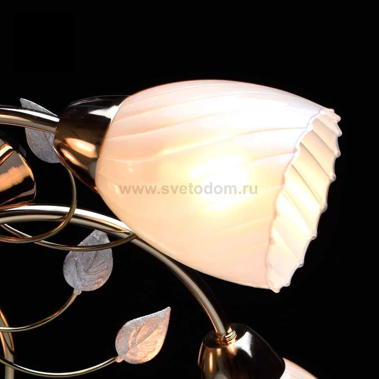 Металлическое основание цвета золота, декоративные элементы в растительном стиле и рельефные стеклянные плафоны жемчужно-белого цвета Место применения
