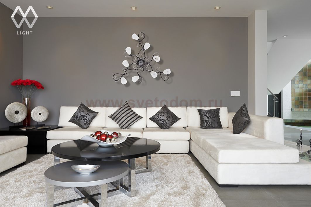 Витиевато сплетёные завитки основания светильника Аида гармонично смотрятся с белыми стеклянными плафонами, направленными в разные стороны. Металлическое основание окрашено вручную, эффектно выглядит сочетание брутальных темно-коричневых оттенков конструкции и легкого, невесомого серебра в виде цветочной розетки. Растительная тематика в потолочном светильнике Аида удачно подходит для оформления интерьеров как дополнительный декор потолка |