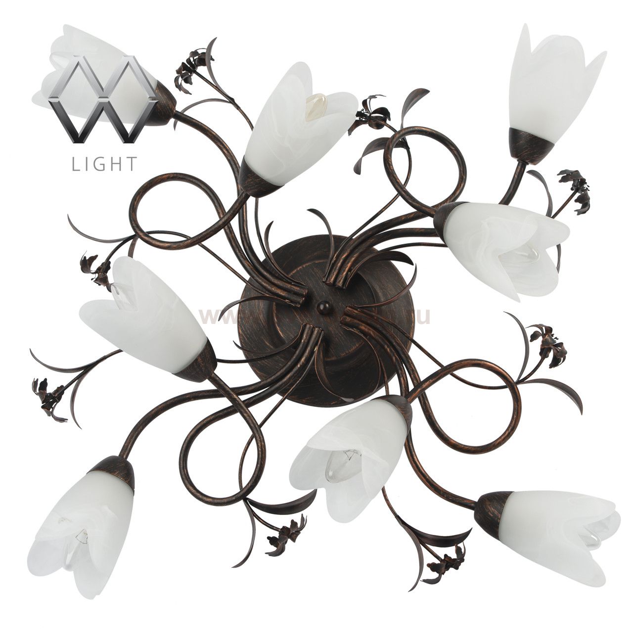 Игривый дизайн светильника Аида живо украсит домашний интерьер и осветит пространство большой площади. Стеклянные плафоны с молочными разводами из алебастра выполнены в виде раскрывающихся бутонов! Патинированное металлическое основание кофейного оттенка вьётся плавными линиями, на которых разместились декоративные элементы из тонко проработанного металла. Благодаря потолочной форме конструкции и светлому оттенку плафонов, светильник по достоинству оценят самые требовательные покупатели.