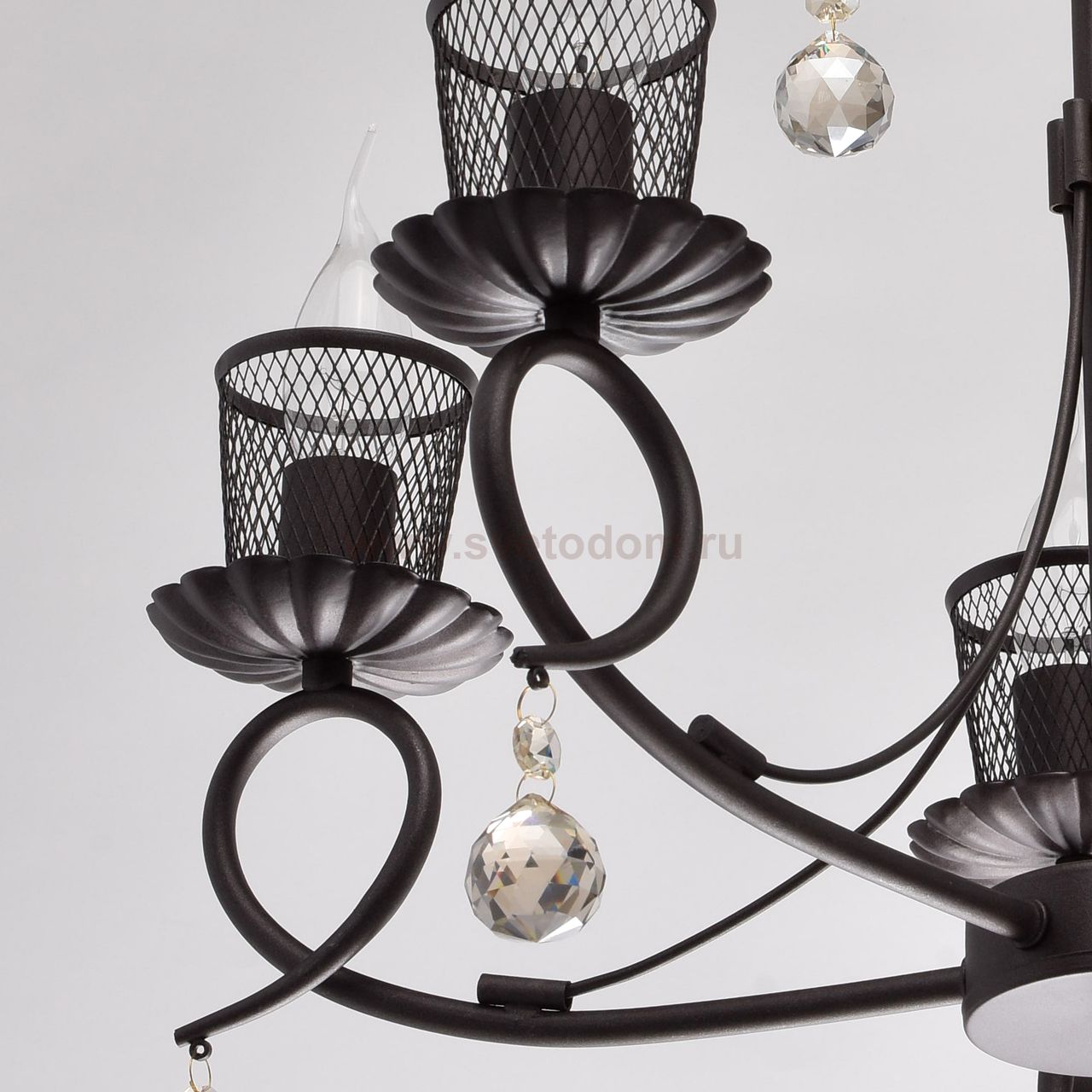 323015505 - это Необычная люстра из коллекции "Аида" сочетает в себе готическую романтичность и классическую красоту. Она выполнена в стиле легкой ковки. Матовое металлическое основание насыщенного кофейного оттенка гармонично сочетается с оригинально расположенными рожками и фигурами розетками. В качестве источников света выступают свечи, каждую из которых окутывает плафон из метализированной сетки. Особый шарм светильнику придают подвесы из хрустального стекла цвета шампань. |
