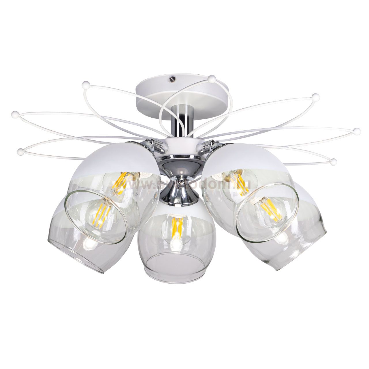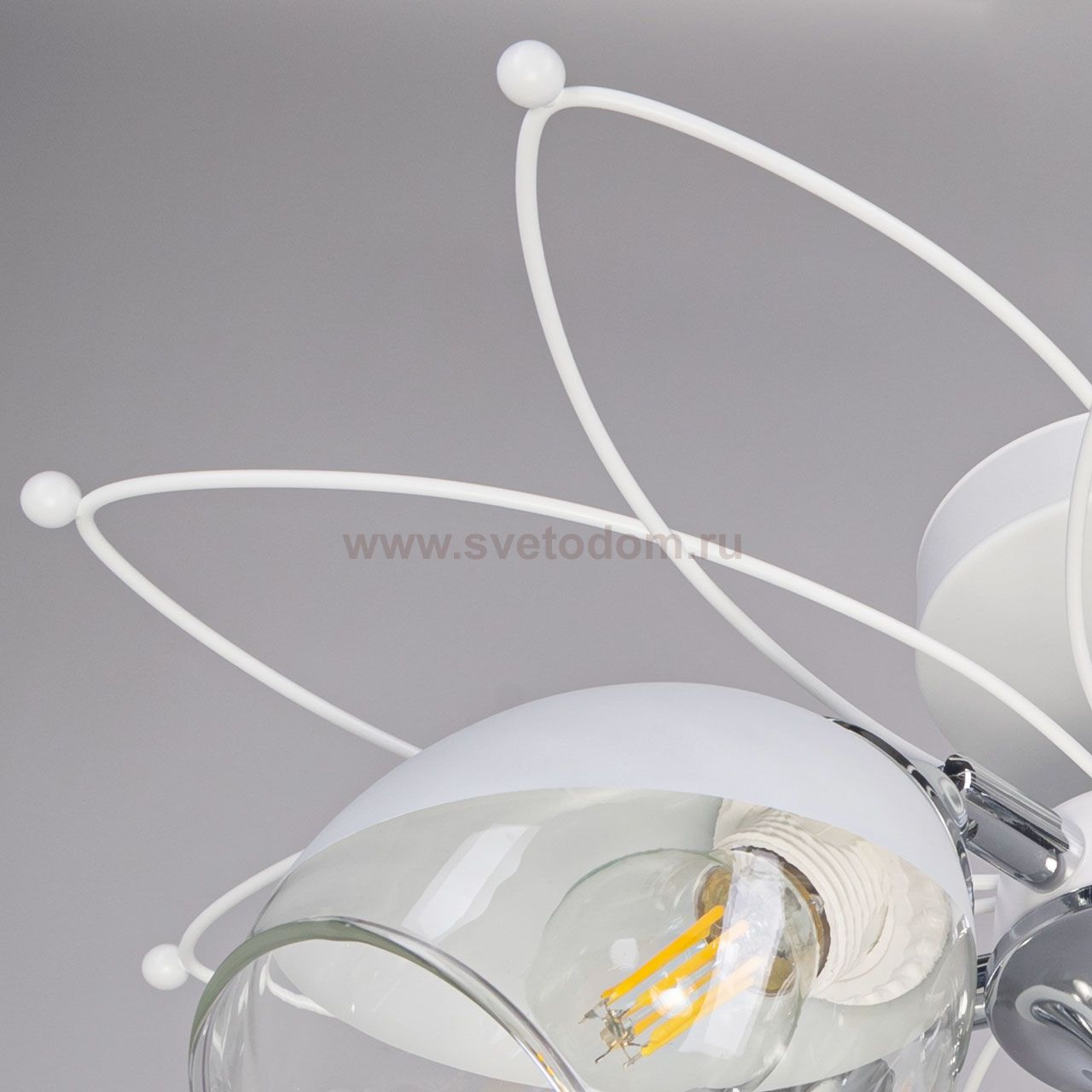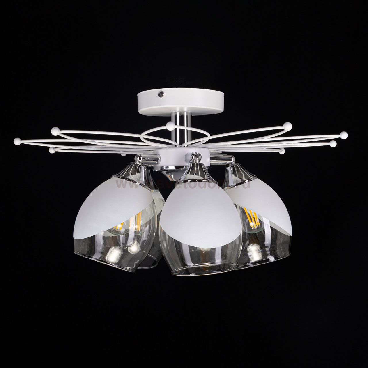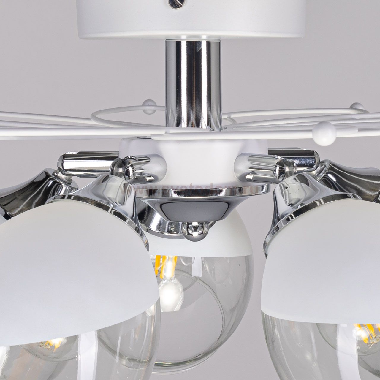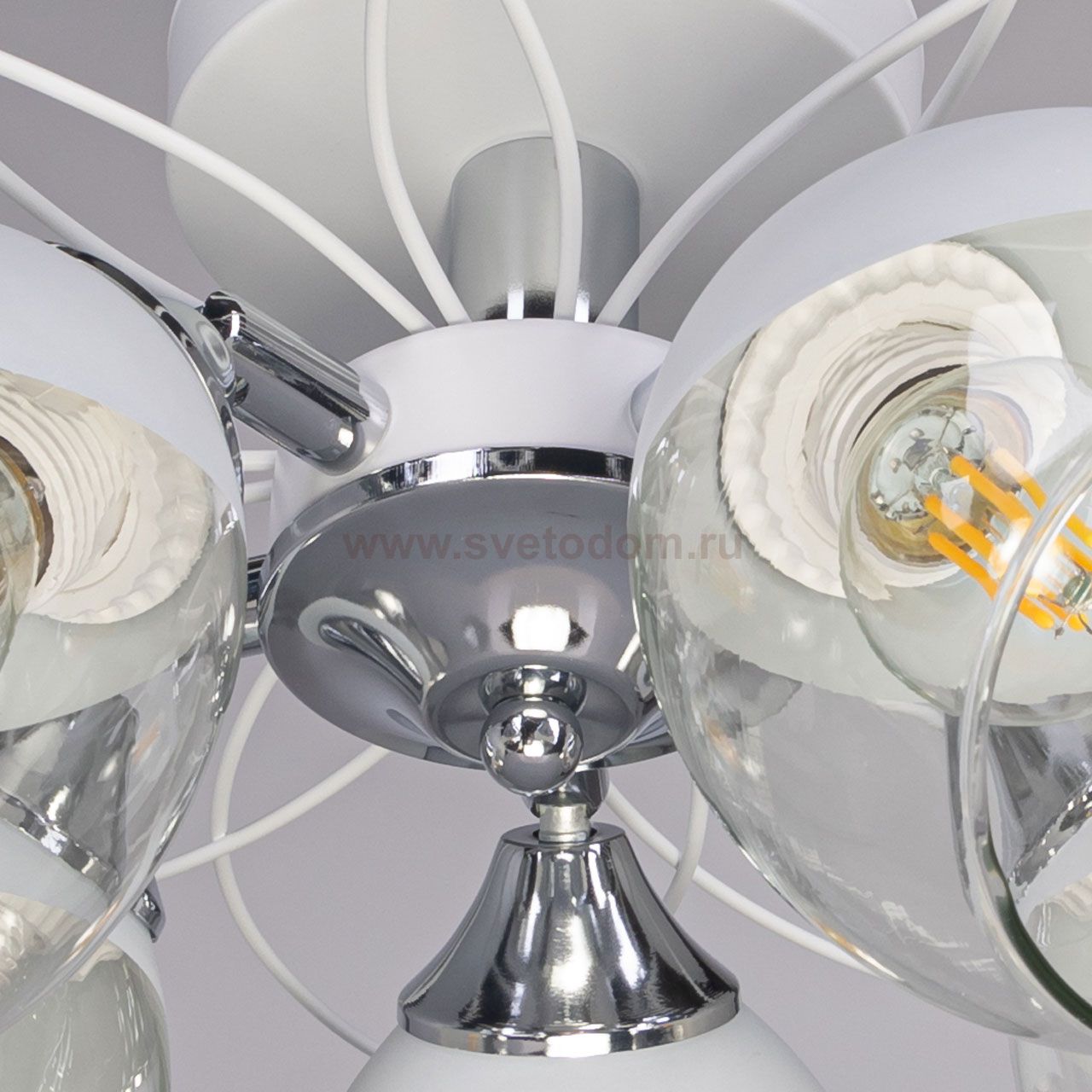 Металлическое основание потолочной люстры окрашено в белый цвет. Отдельные элементы основания гальванизированы в цвет хрома. Потолочная люстра декорирована выдувными вручную стеклянными плафонами. Плафоны у основания окрашены в белый цвет. Комментарий