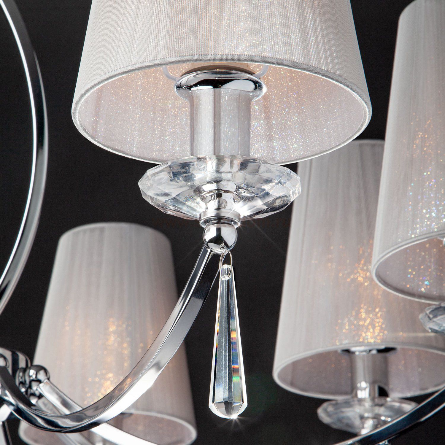 Люстра украшена эффектным декором из хрусталя и дополнена выразительными тканевыми абажурами. Арматура изготовлена из высококачественного металла с надежным защитным покрытием.