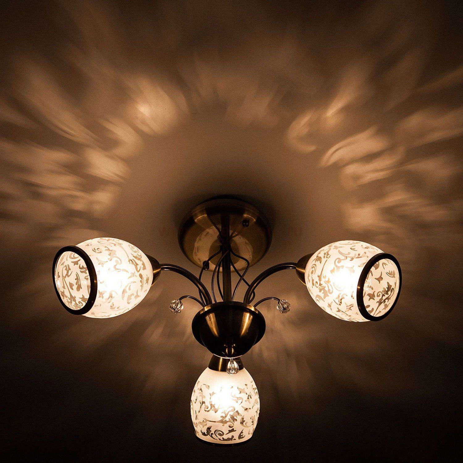 Люстра оснащена патронами с цоколем Е27, которые рассчитаны на максимальную мощность ламп 60 Вт. Люстра дополнена выразительными стеклянными плафонами с узорами, мягко рассеивающими свет, создавая нежную композицию на потолке. Арматура изготовлена из высококачественного металла с надежным защитным покрытием.