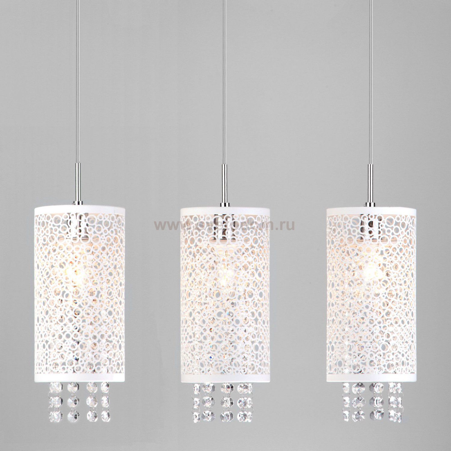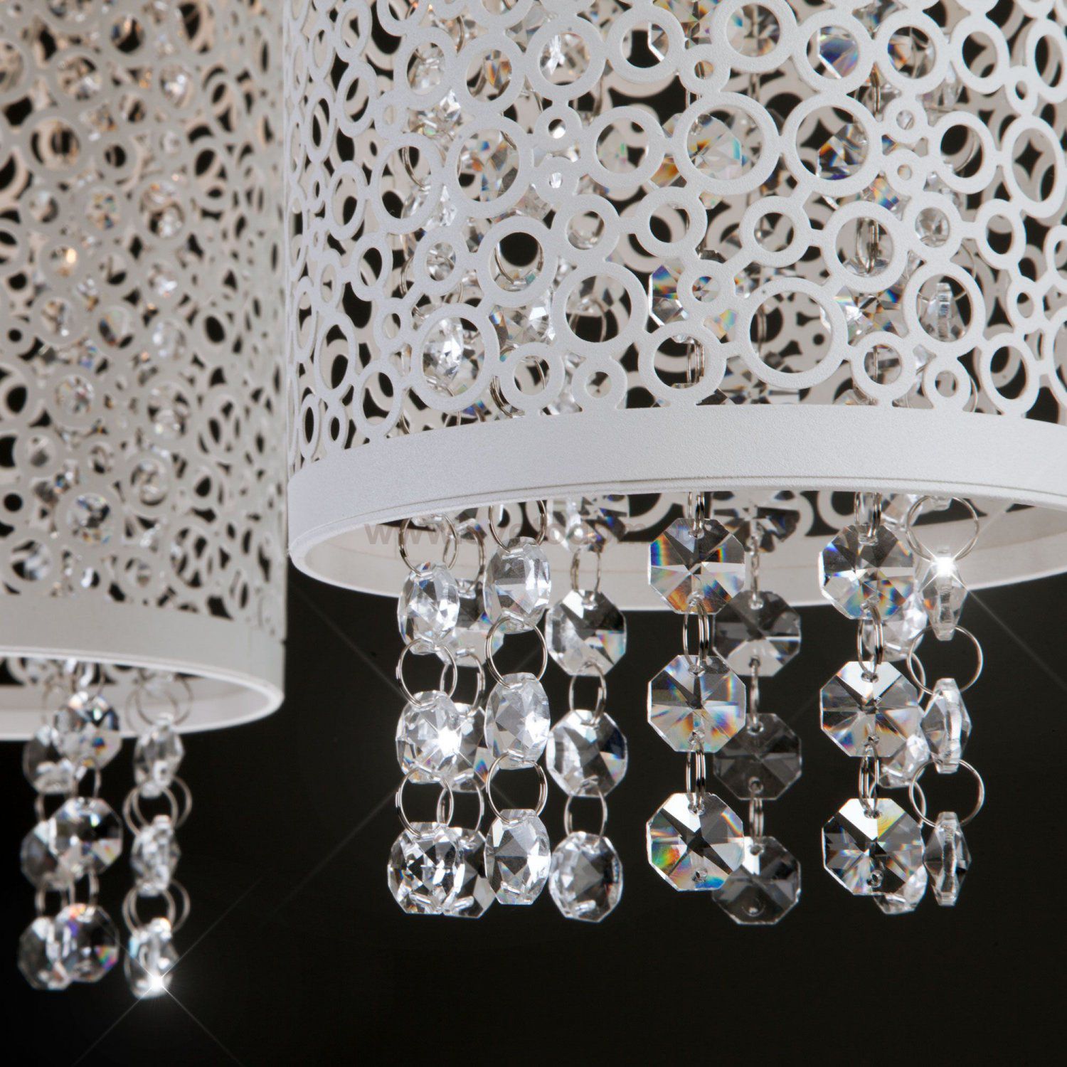 Светильник с металлическими плафонами белого цвета, украшен декоративным хрусталем, оснащен системой регулировки высоты подвеса, позволяющей размещать изделие на разных уровнях, уменьшая или увеличивая угол рассеивания светового потока. Данный светильник легко устанавливается на потолке при помощи монтажной планки.