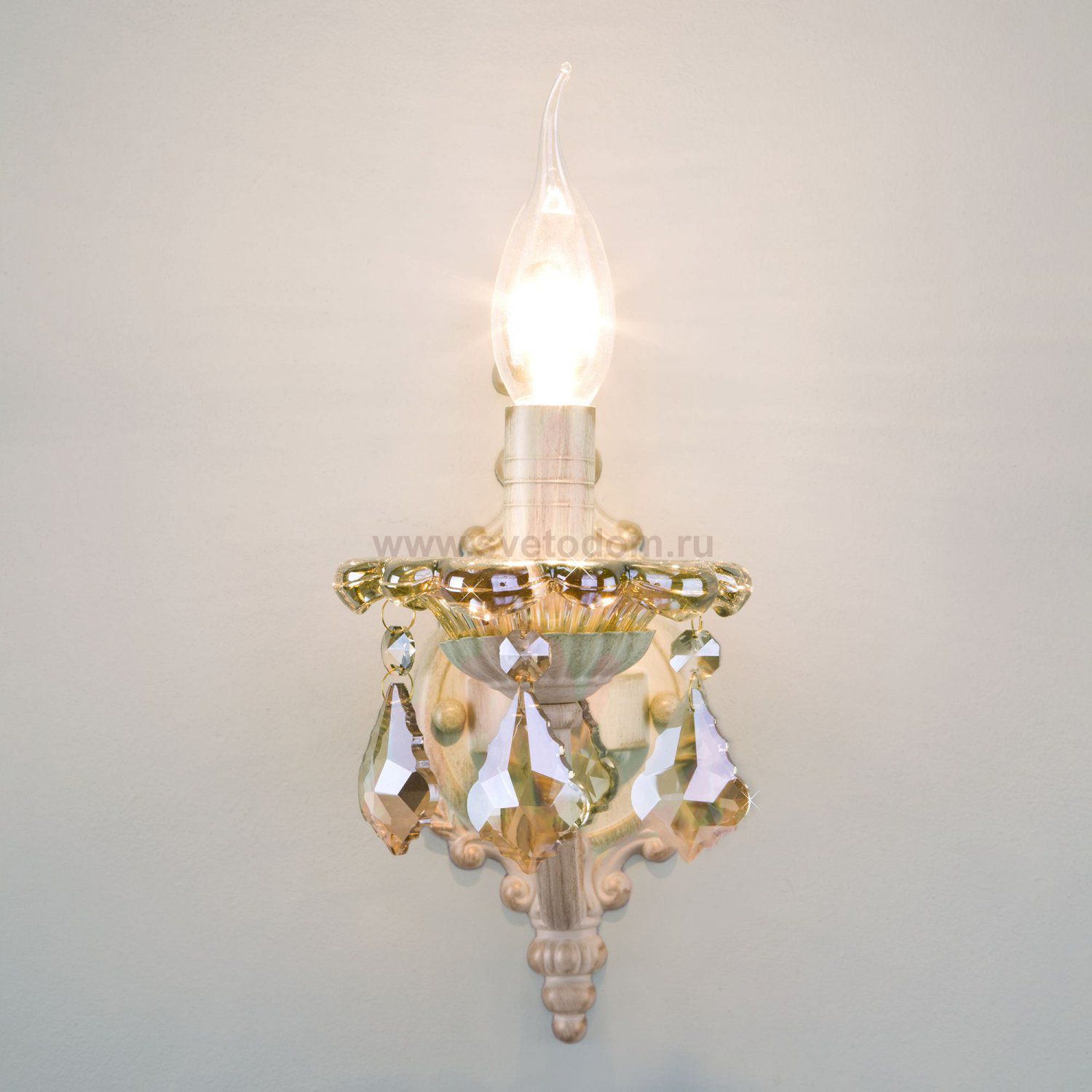 Бра с тонированным хрусталем 3281/1 белый с золотом/тонированный хрусталь Strotskis станет ярким световым акцентом в классических интерьерах и создаст качественное освещение на площади 5 м². Изящные чаши подсвечников украшены хрустальными подвесками, которые искрятся в лучах света, наполняя помещение выразительным блеском. В качестве источника света используются сменные лампы типа свеча на ветру с цоколем E14.