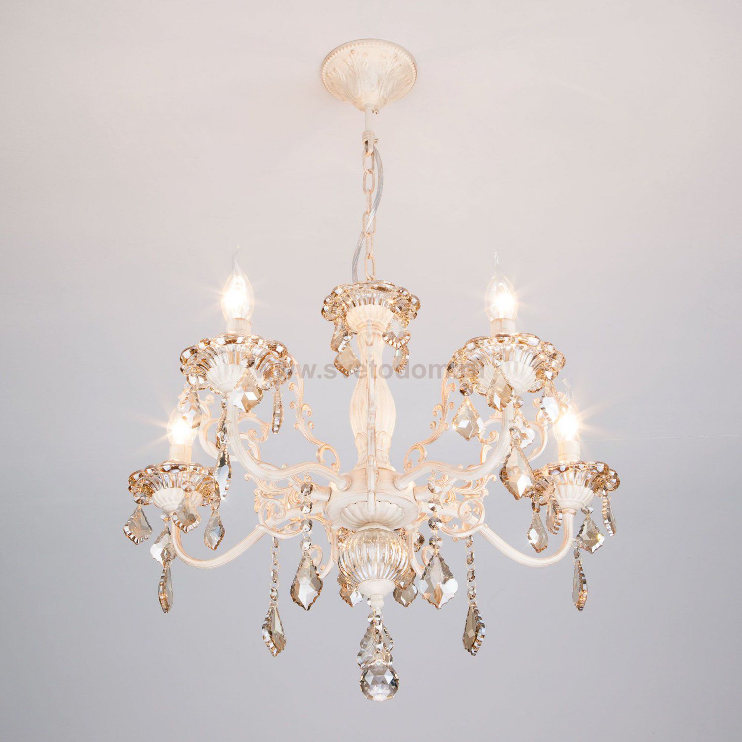 Классическая хрустальная люстра на 5 рожков в цвете белый с золотом / тонированный хрусталь преобразит потолочное пространство и создаст в вашем помещении комфортное полноценное освещение на площади 24 м кв. Изящные формы и классический стиль добавят вашей гостиной утонченного аристократизма.