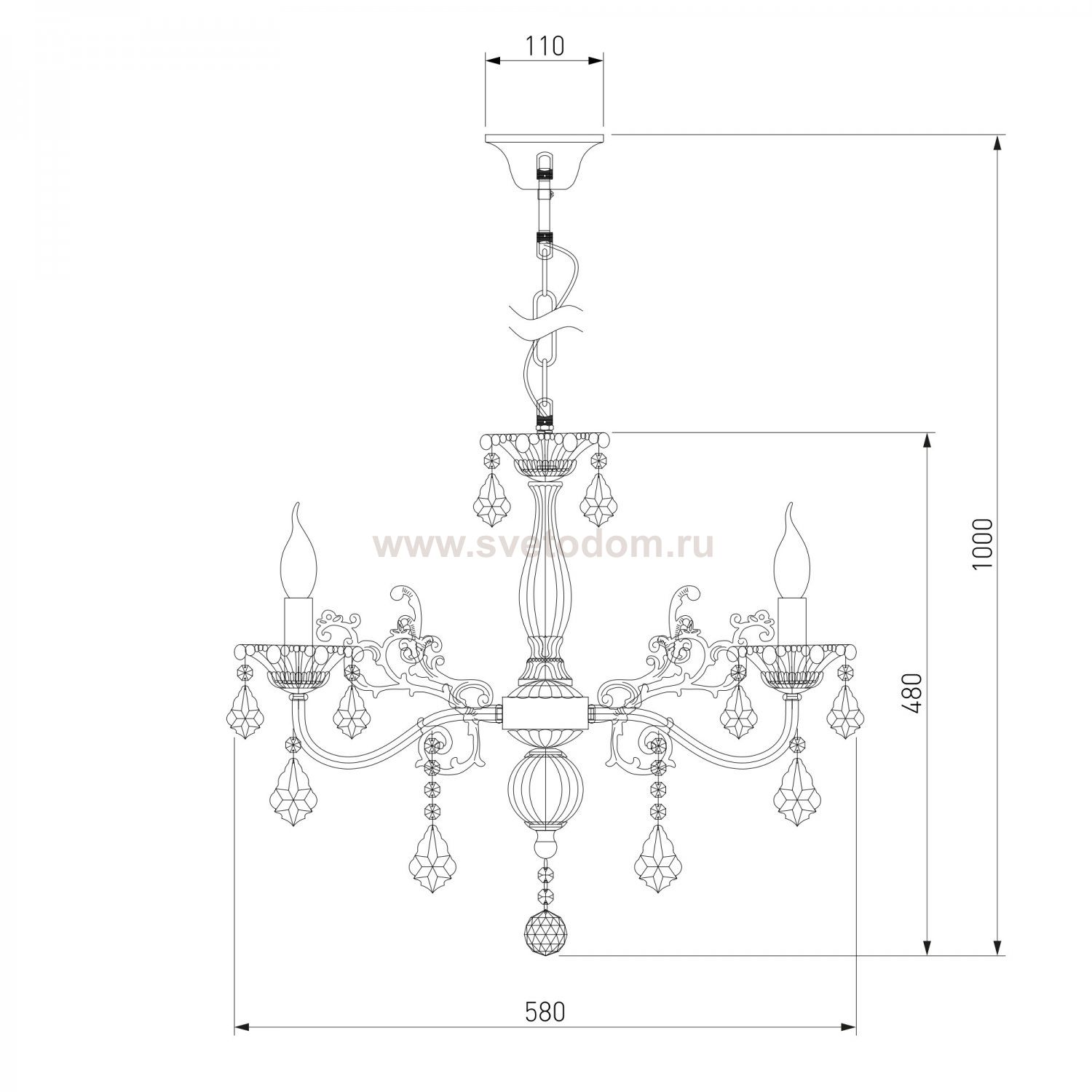 Декоративные рожки в виде подсвечников, украшенные сменными лампами с цоколем E14 типа свеча на ветру переливаются на свету яркими завораживающими бликами. В производстве подвесной люстры использовали особое стекло с эффектной огранкой и высококачественный металл с надежным защитным покрытием.