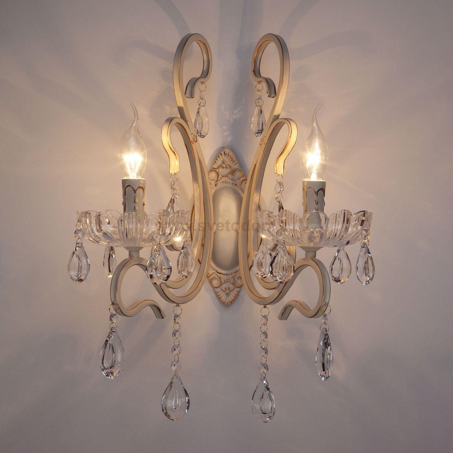 Бра с хрустальным декором 12205/2 двухрожковый станет ярким световым акцентом в классических интерьерах и создаст качественное освещение на площади 6 м². Изящные чаши подсвечников украшены хрустальными подвесками, которые искрятся в лучах света, наполняя помещение выразительным блеском. В качестве источника света используются сменные лампы типа свеча на ветру с цоколем E14. Патрон рассчитан на максимальную мощность ламп накаливания 40 Вт.
