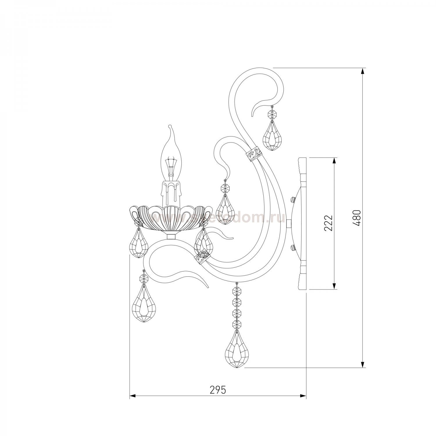 Корпус светильника выполнен из высококачественного и прочного металла с надежным покрытием. Бра легко устанавливается при помощи крепежной планки, которая обеспечивает надежную фиксацию светильника на стене. Классическое бра с легкими формами гармонично сочетается с хрустальными люстрами и станет отличным завершением композиции вашей гостиной или спальни.