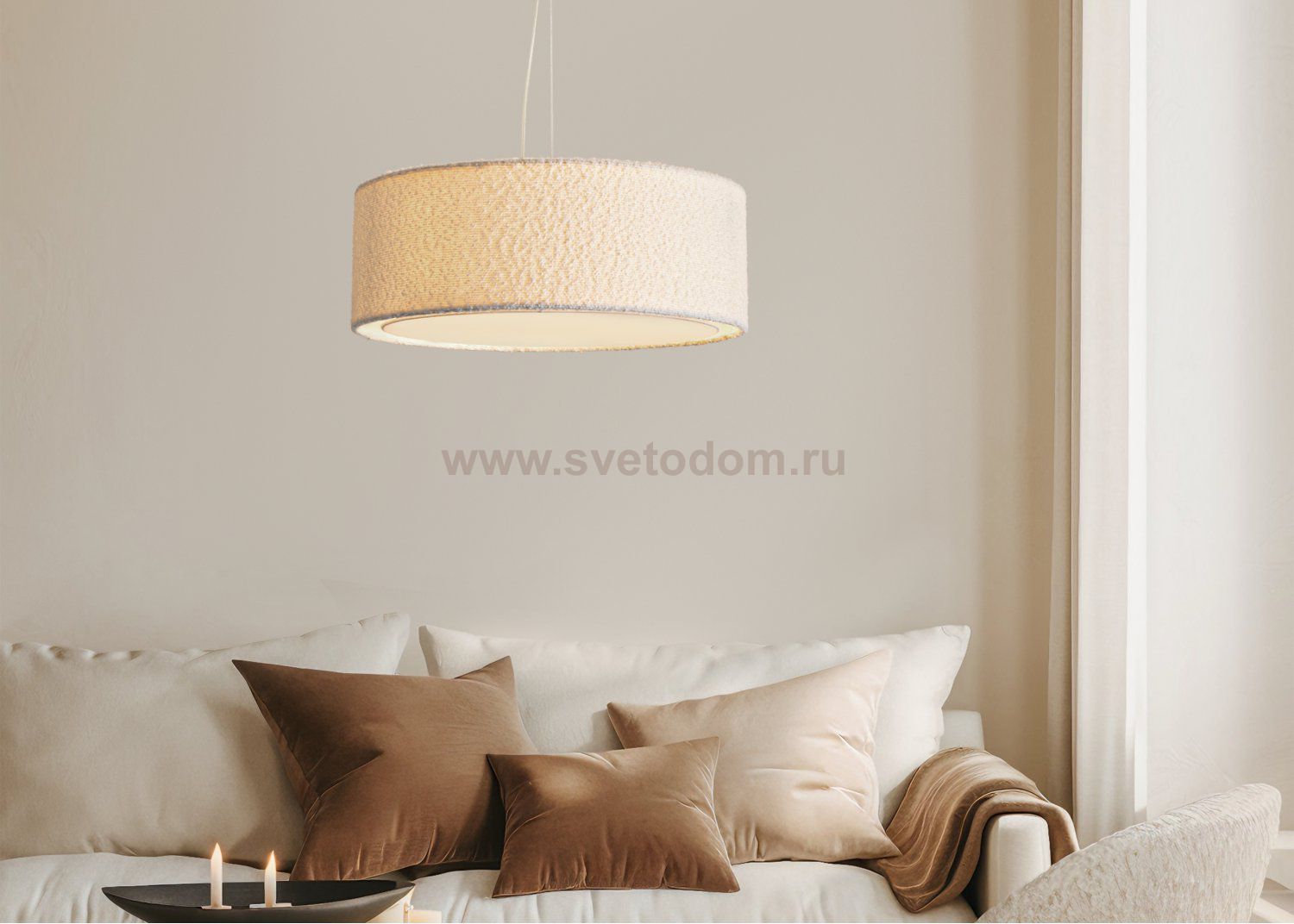 Арматурат - металл в цвете латунь. Подвесной светильник с фактурным белым тканевым абажуром. Дополнительный рассеиватель из ткани. Лампы E14 (не включены). Регулировка 250-850 мм.