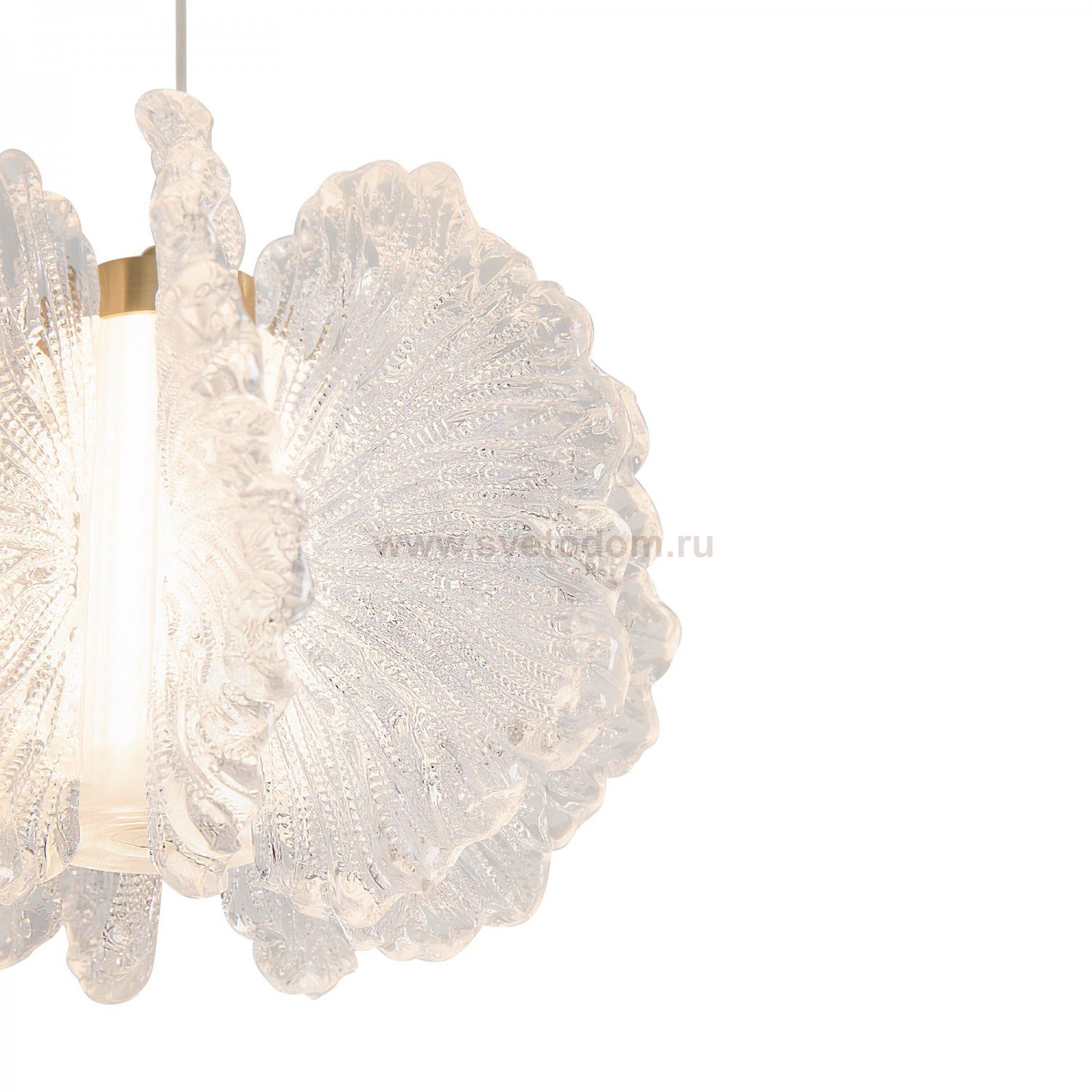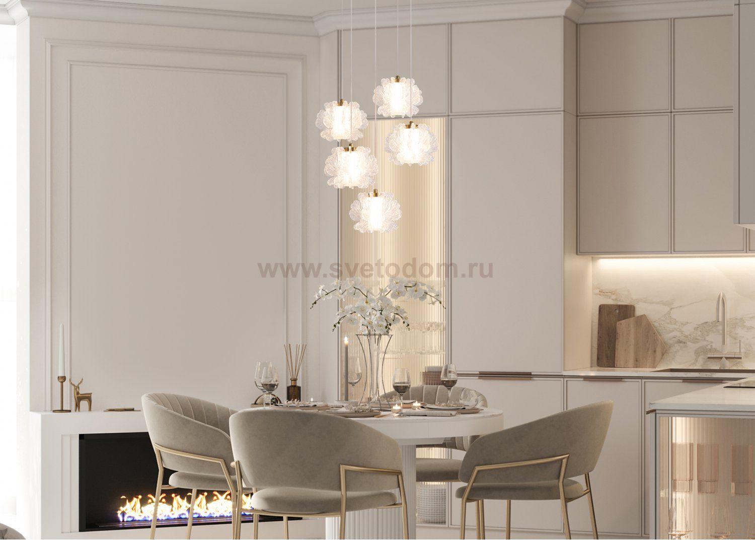 Подвесные светильники Flower: воздушные акриловые плафоны на металле. Встроенные LED (2700K), угол рассеивания 120°. Высота 1200 мм. Два варианта подвесов: каскадный и одинарный.