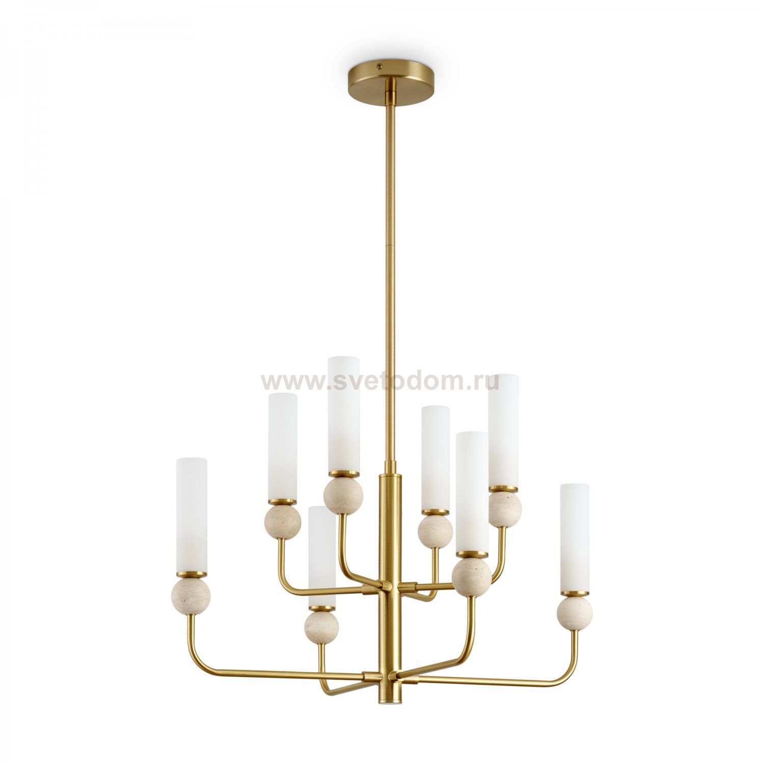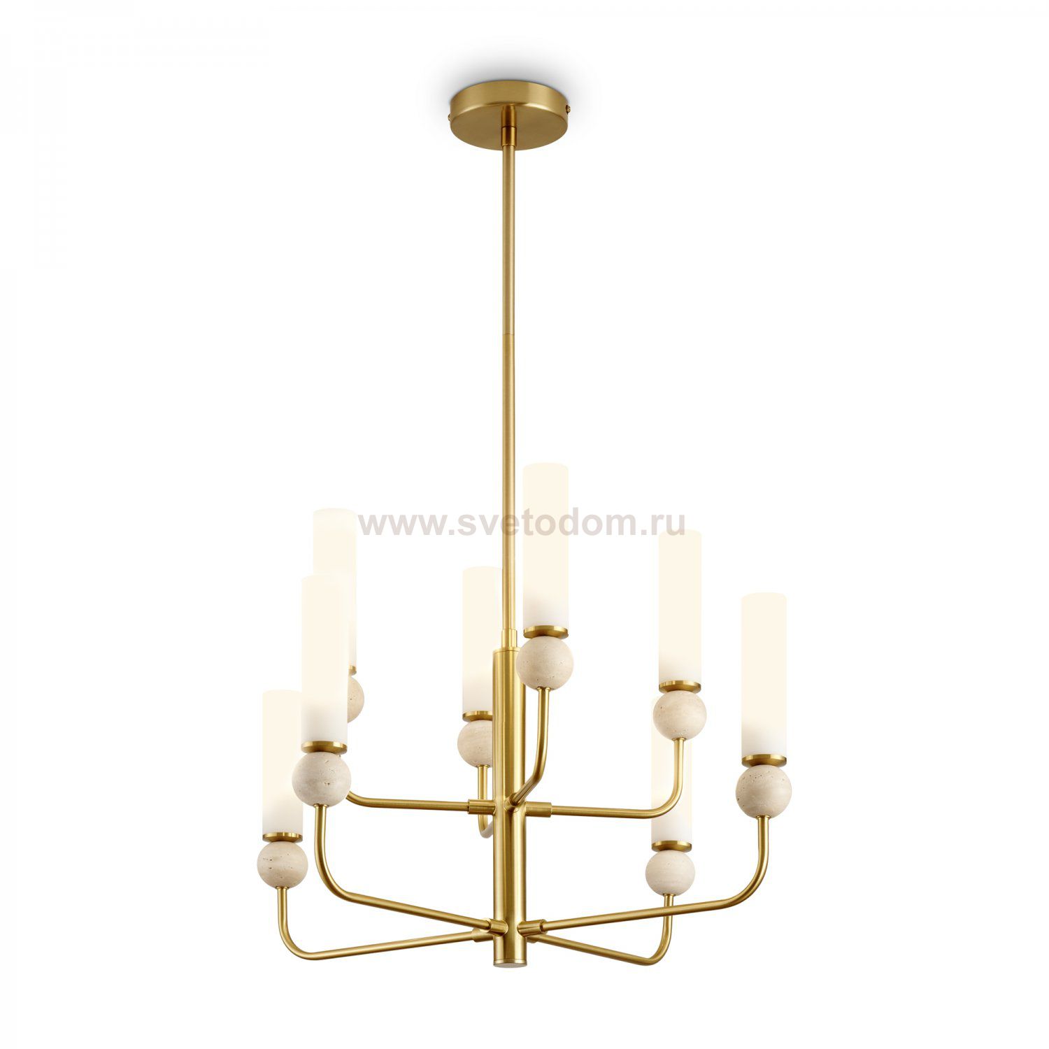 Натуральный травертин и стеклянные плафоны. Металл (латунь, черный). Матовые белые абажуры. LED 3000K (E14/G9, не в комплекте). Сенсорное управление. Подвесные светильники с декоративным элментом травертина в виде шара.