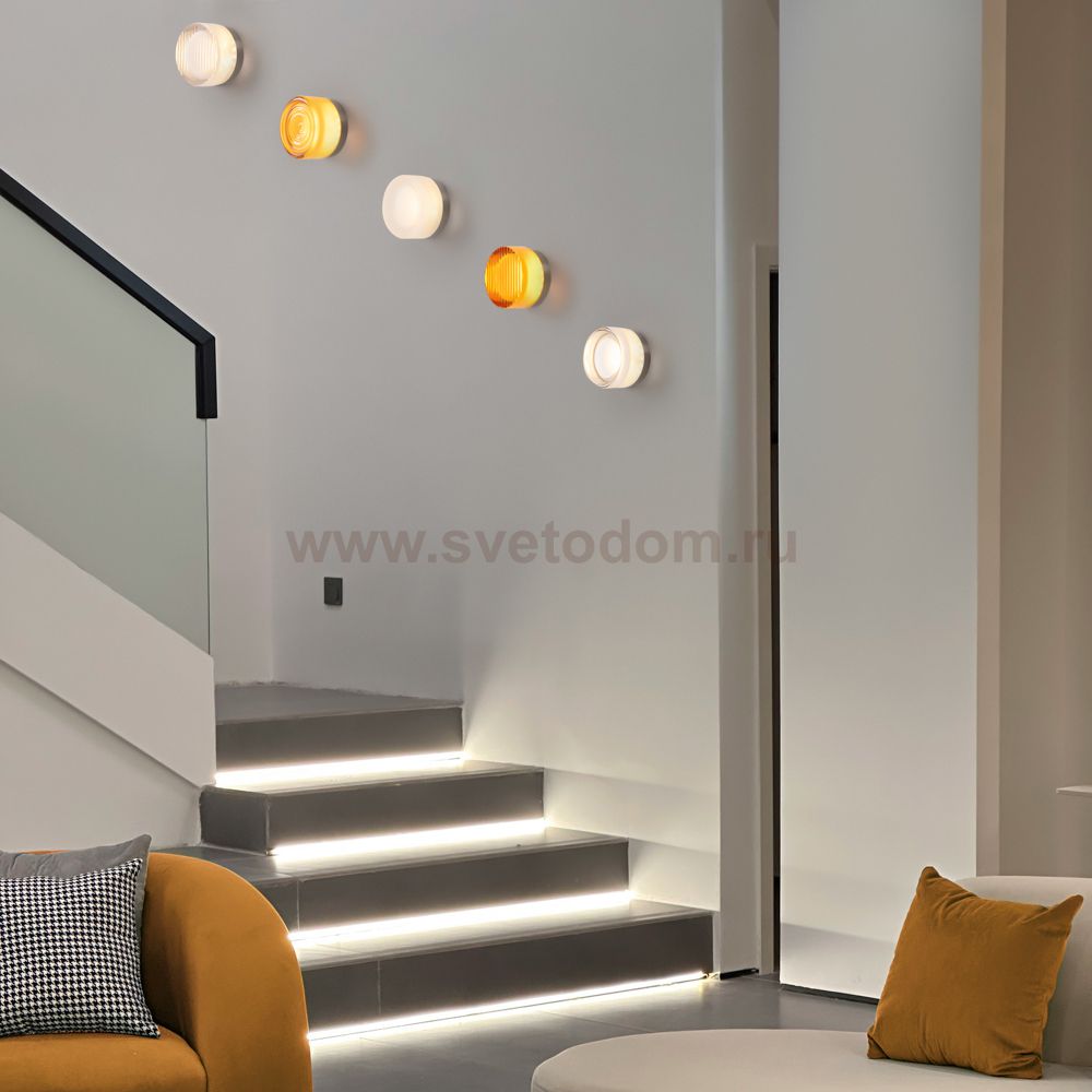 Металлическая арматура в цвете никель в трех рельефных основаниях. Плафоны, выполненные в приглушенно пшеничном и янтарном оттенках, доступны в двух размерах. LED источник света 2400К/2550К/3000K.