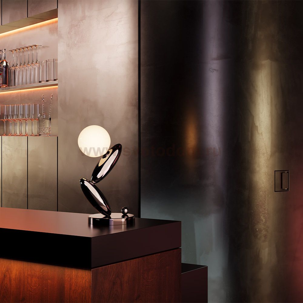 Серия переносит эстетику городских арт-объектов в приватное пространство. Глянцевые холодные оттенки металла (платина и черный никель) сочетаются с молочно-белым стеклом плафона. Сенсорный металлический шар регулирует яркость LED-источника (3000К). Зеркальная поверхность металла деликатно переотражает свет. В серии также представлена лимитированная версия в глянцевом медном цвете с платиновыми акцентами. Настольный светильник становится амбициозным акцентом в современных интерьерах.