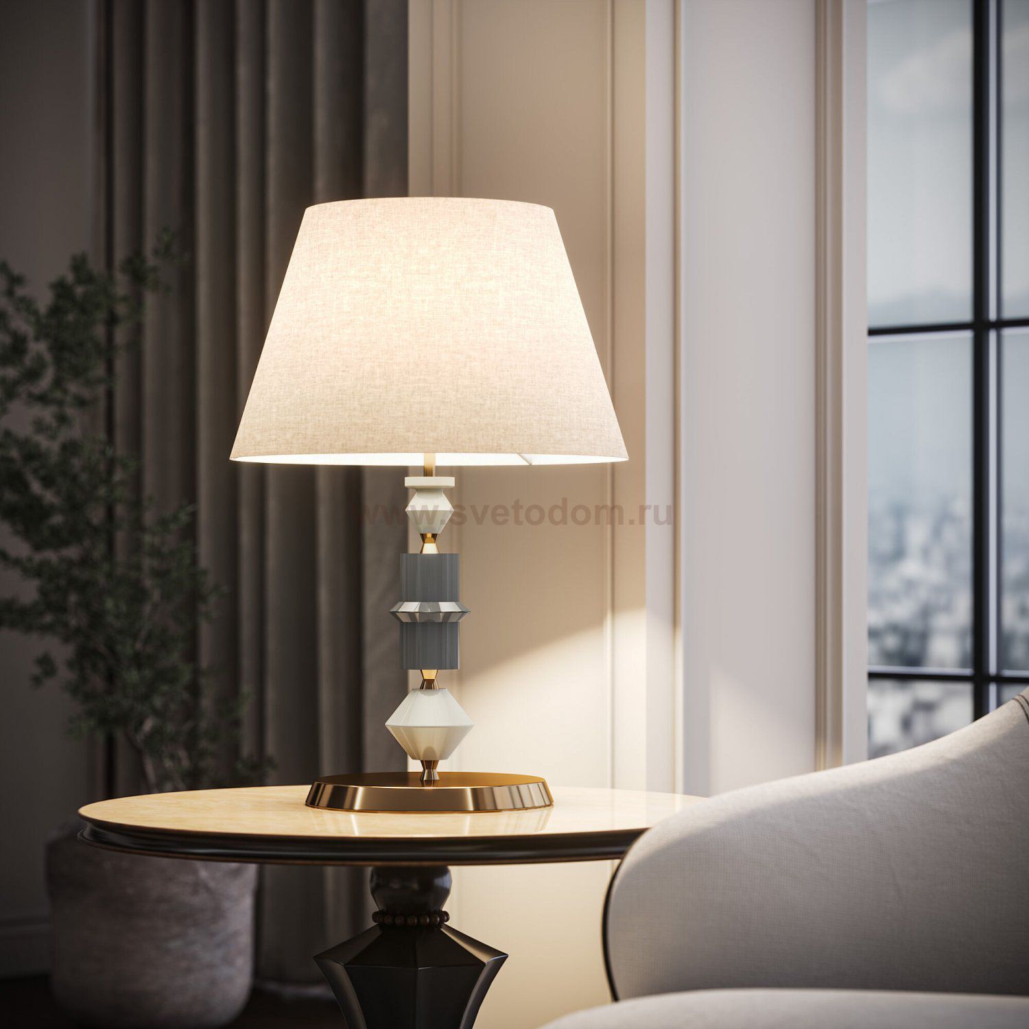 Настольная лампа 108012 с абажуром из ткани создаст приятное и нежное освещение в вашей спальне, гостинной или даже в прихожей. Сочетание геометрических форм из керамики с деликатной латунной арматурой создает стильный акцент в любом интерьере.