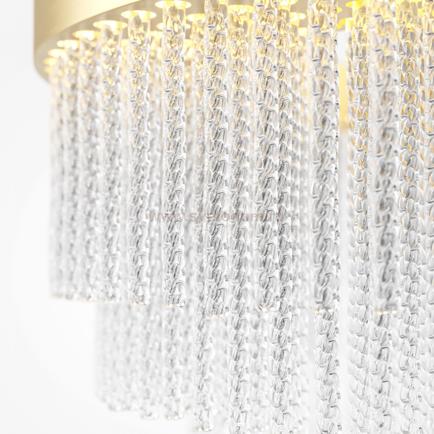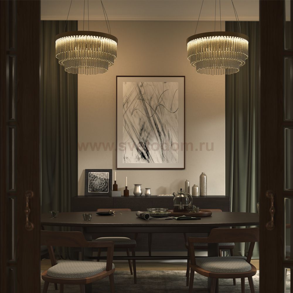 Арматура выполнена из металла в цвете латуни с легким мерцающим финишем. Декоративные элементы: стеклянные трубочки с витиеватым орнаментом, игриво переотражающим свет. Встроенный LED-источник, создающий свет достаточный для основного освещения. Трехступенчатый переключатель позволяет выбирать цветовую температуру: 2700K, 3000K или 4000K. Высота светильника регулируется, максимальная высота - 3300 мм. Высокий индекс цветопередачи CRI >90. Создает изысканное освещение с игрой бликов и переотражений.
