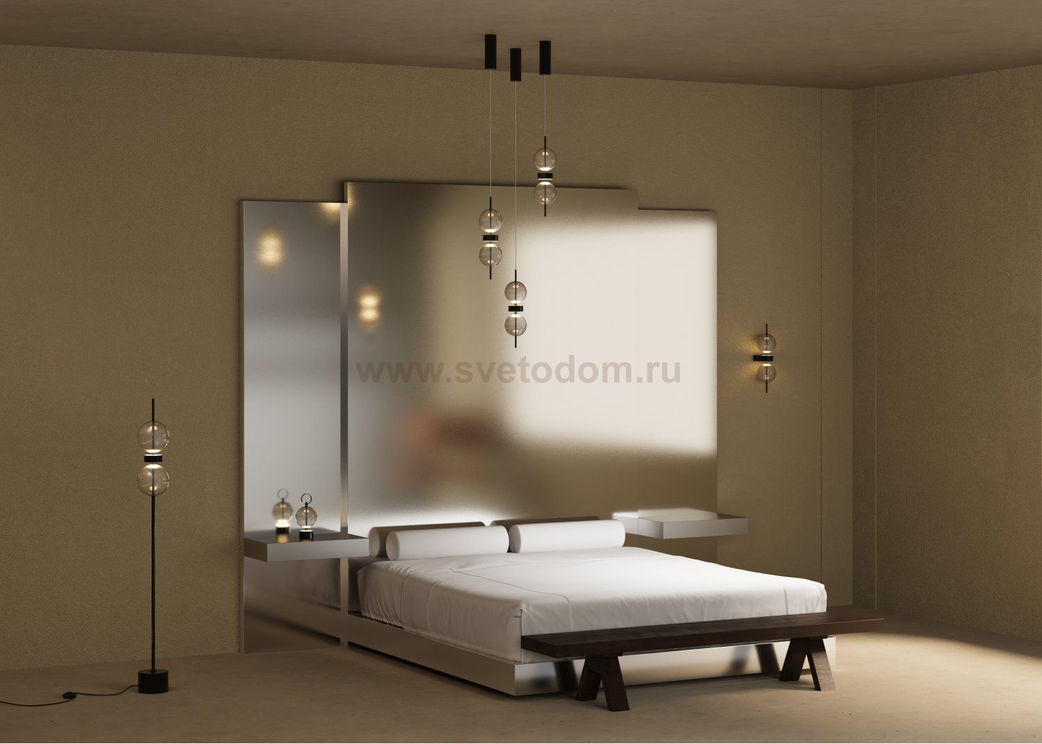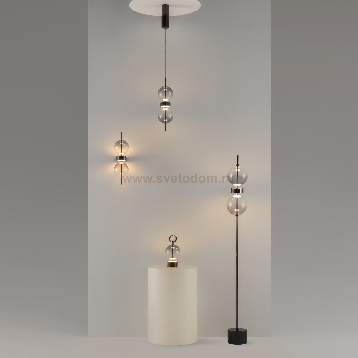 Серия включает подвесной светильник, бра, напольный и портативную модели. Стеклянные плафоны с зеркальным градиентом, черная глянцевая арматура из металла. LED-источник (3000K) скрыт матовым рассеивателем. Конструктивные особенности: магнитные потолочные чаши у подвесов и магнитное основание у бра обеспечивают монтаж без видимого крепежа. Напольный и аккумуляторный светильники диммируются при длительном удержании кнопки. Серия отмечена премиями Red Dot и A’design за инновационный дизайн.