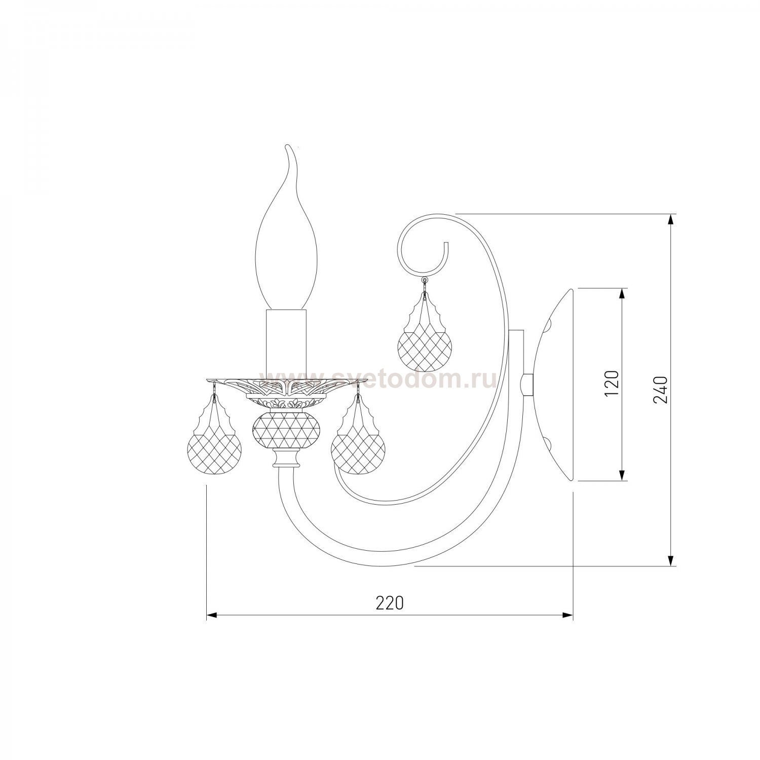 Классический настенный светильник 3305/1 — словно отголосок эпохи дворцовых балов. Латунная арматура с изящными вензелями мягко мерцает в свете, а бесцветный хрусталь ловит и преломляет каждый луч, рассыпая по стенам россыпь бликов.